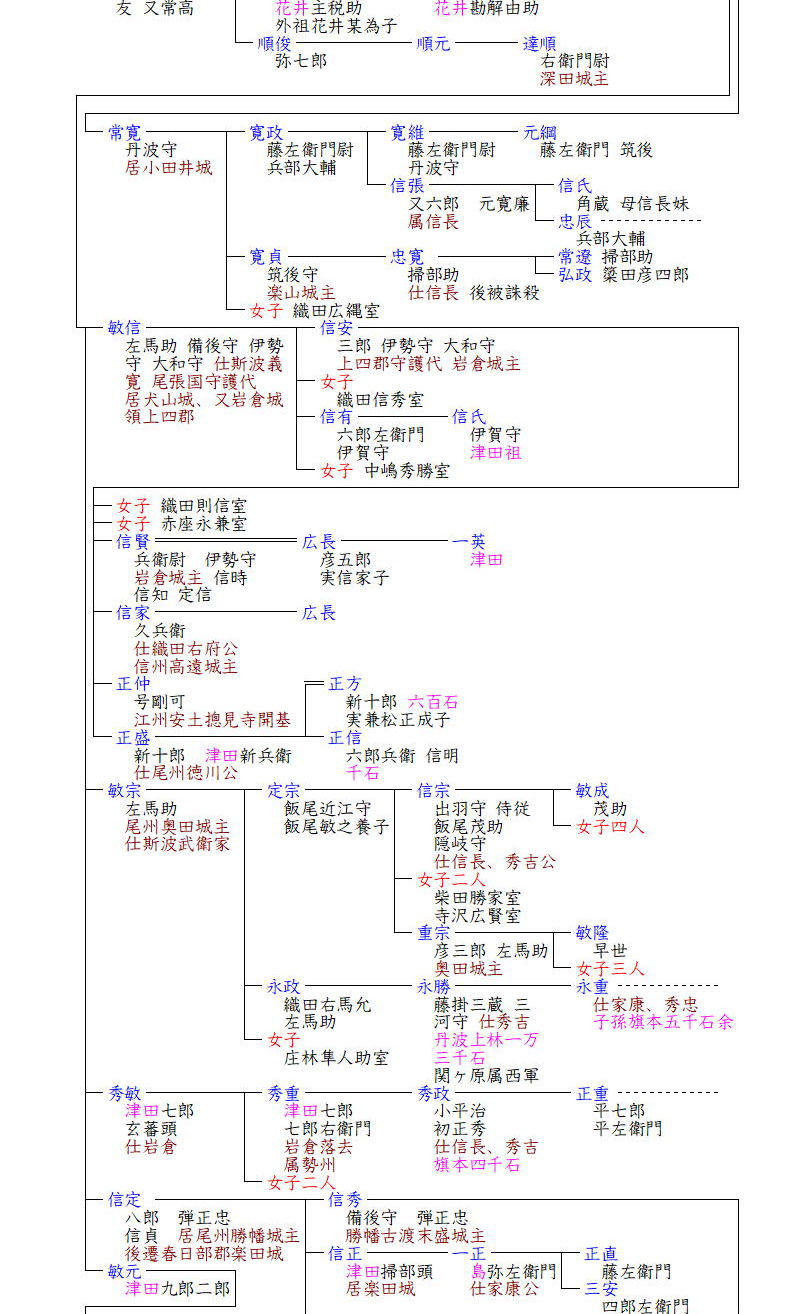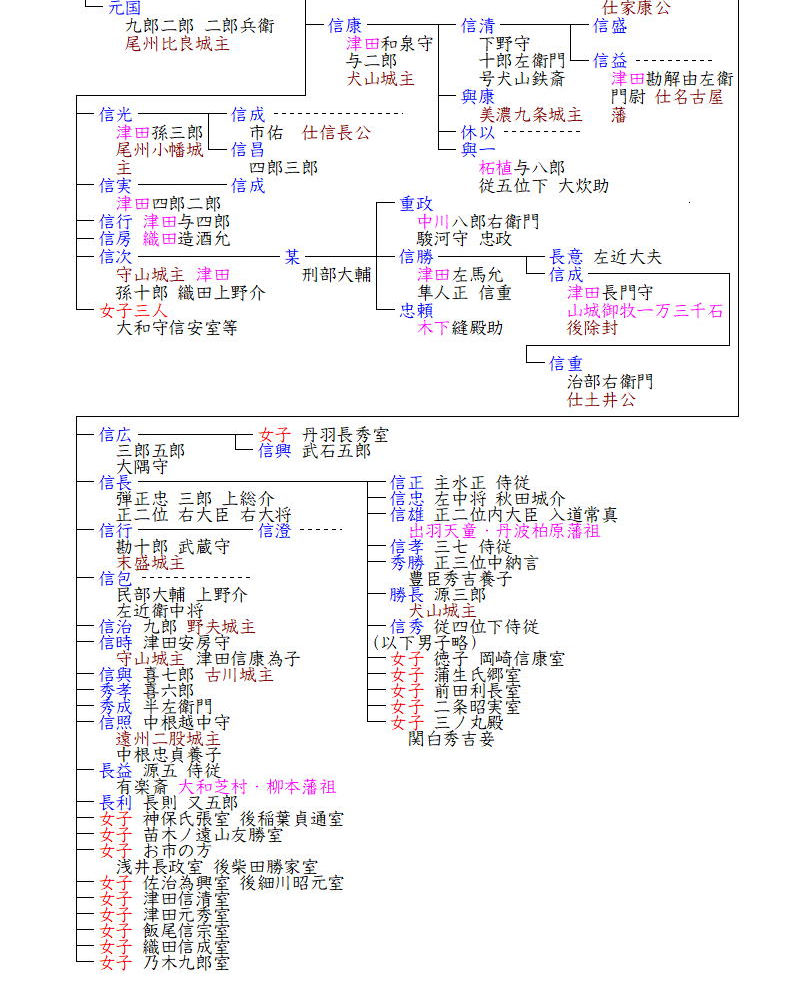 この織田家三家は戦国の覇者織田信長の末裔となります。織田氏の系図の多くはその祖を桓武平氏の平清盛の孫資盛とし、その遺児親真が近江国津田郷に匿われていたところ、越前国織田荘の織田明神社の神官がもらい受け養子としたとしていますが、これについては現在は後世の創作だろうとされています。