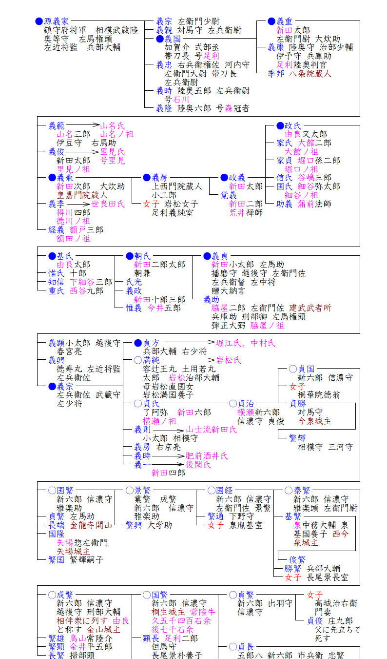 その後、子貞繁が跡を継ぎ大坂の陣にも出陣します。しかし、元和7年に没した際に嗣子としていた弟貞長を正式に拝謁させていなかったため采地没収となり、改めて貞長に1000石を賜い、かろうじて家名断絶は免れました。そして子貞房の代の寛文5年(1665)に高家に列し、以後、貞房・頼繁・貞整・貞通・貞靖・貞時と奥高家を務め、貞靖は高家肝煎を務め、貞時の時に維新を迎えました。貞時は新田姓に復し、新政府の中大夫席に列せられましたが、明治4年(1871)他の旧高家衆・旧交代寄合の一部とともに士族となりました。明治維新後は、明治政府に新田義貞の嫡流であることを訴え、同じく新田氏嫡流を主張する岩松氏と対立しました。しかし、貞時・貞善・貞観(さだみ)と相次いで当主が亡くなった由良系新田氏は急速に衰退し、岩松系新田氏の新田俊純が華族に列せられ、男爵となりました。