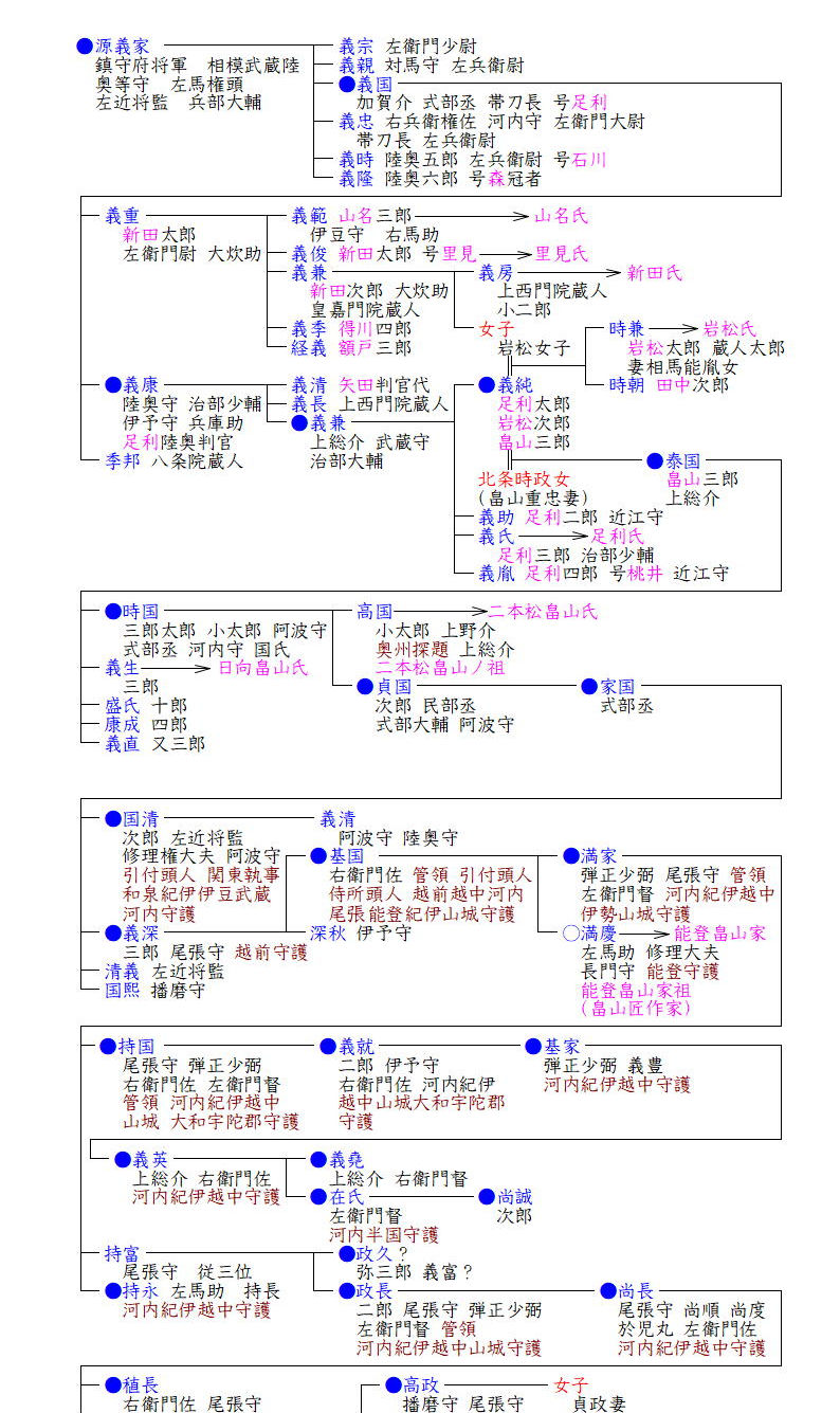 畠山家は足利義兼の長男義純から出ています。義純は足利義兼の長男ですが、母が遊女だったので庶子とされ、父は従兄弟に当たる新田義兼の娘のもとに義純を入り婿させ新しく一家を興させました。こうして、血統的には足利氏だった義純は、新田党の一員となり、「岩松次郎」を名乗りました。