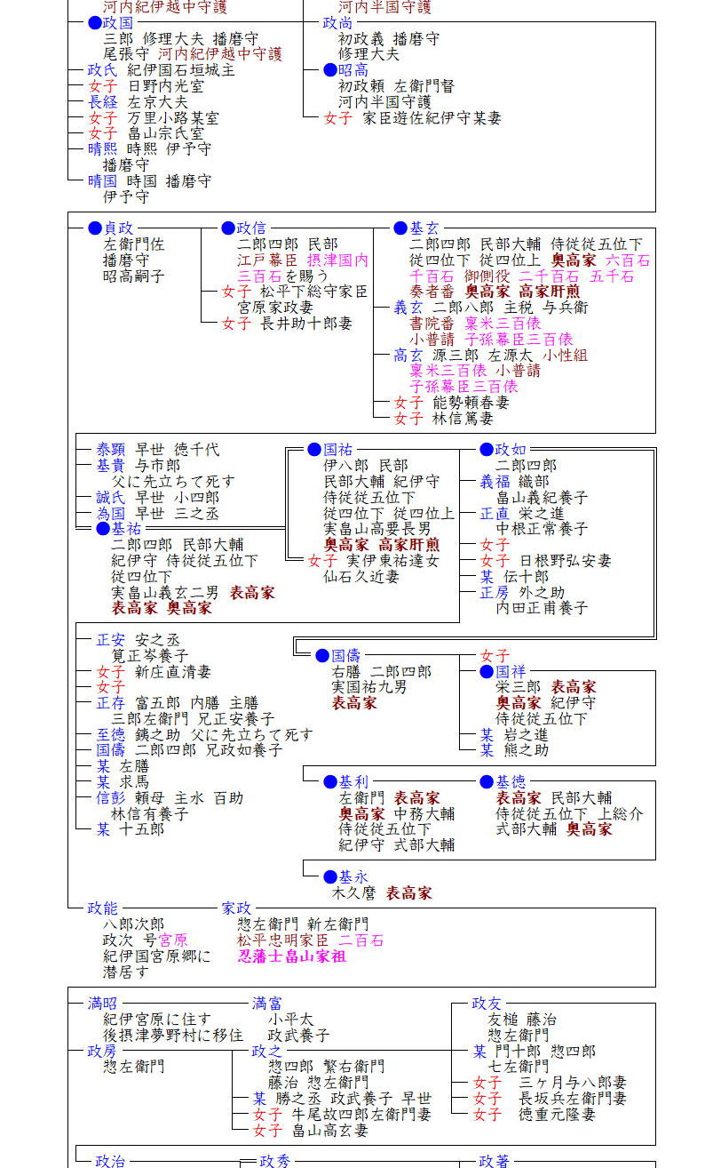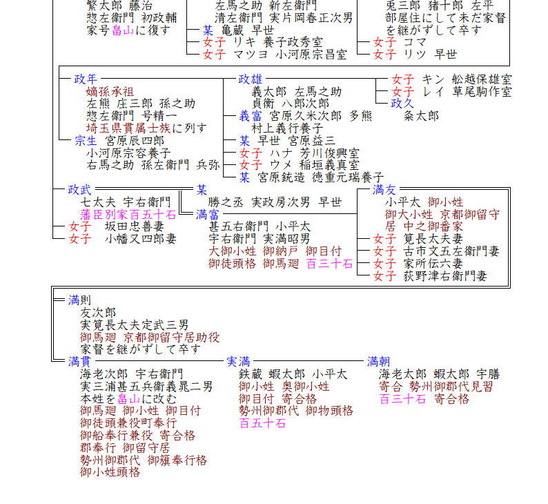 一方、政長系の畠山尾州家もその頃には重臣の遊佐氏の傀儡となっており、稙長の後、家臣遊佐氏・安見氏らによって当主はすげ替えられ、天正2年(1574)昭高が遊佐信教の謀反によって自殺すると畠山氏は没落し、昭高の甥貞政の子政信は徳川家に仕えて幕臣となりました。政信の子基玄(もとはる)の代に奥高家となり、以後、基祐・国祐・国祥・基利・基徳と奥高家となり、基玄・国祐は高家肝煎を務めました。また基玄の弟二人からは分家の旗本家を出し、貞政の弟政能の子孫は、徳川家康の外孫(長女亀姫の子)松平下総守忠明に仕え、忍藩士として維新を迎えました。
