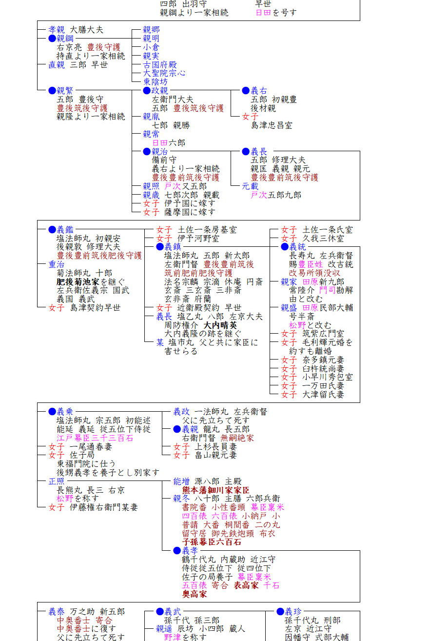 応仁の乱後、十七代義右(よしすけ)が家督を継ぎますが、父政親と不和となり、明応5年(1496)に病死しますが、父によって毒殺されたと伝えられています。政親も筑前に逃れる途中、大内氏に捕らえられ自害させられ、大友氏は滅亡の危機に追い込まれます。この事態を収拾したのが政親の弟親治で、幕府から大友家当主の承認は得られませんでしたが、大友家当主として実績を積み、子息親匡(ちかまさ)は将軍義高(義澄)から豊後・豊前・筑後国守護職を安堵され、「義」の一字を賜って義親(のち義長)と称しました。義長の子義鑑(よしあき)は豊後・筑後・肥前国守護職に補任され、周防大内氏・肥後菊池氏と戦い、その子義鎮(よししげ)(宗麟)の代には豊前・筑前・肥前にまで進行し九州全域を視野に入れました。