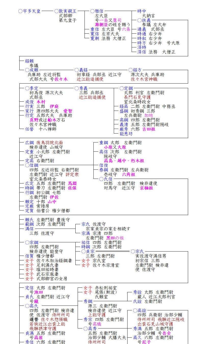 京極家は宇多源氏の流れをひく近江の佐々木氏の一流です。近江の佐々木氏というと源平時代に源氏の武将として活躍した佐々木秀義とその息子たち(定綱・高綱・盛綱など)が有名ですが、京極家の祖は定綱の子信綱の四男氏信にまで遡ります。氏信は信綱から京都の京極高辻にあった屋敷を伝領したところから京極氏と呼ばれました。佐々木氏の惣領となったのは氏信の兄の三男泰綱(六角家)で、残りの二人の兄重綱・高信はそれぞれ大原・高島家の祖となり、佐々木氏は惣領家の六角家に大原・高島・京極の三庶子家に分かれました。