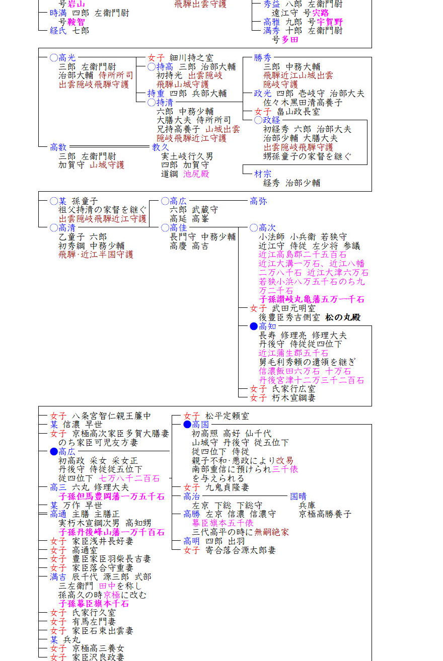 高佳の子高次は織田信長に仕え、高次の妹(松の丸殿)が豊臣秀吉の側室となることで織豊大名として生き残り、関ヶ原の戦いの後は若狭小浜9万200石を与えられました。高次の子孫は出雲松江藩主→讃岐丸亀藩主として江戸時代を生き抜いていくこととなります。