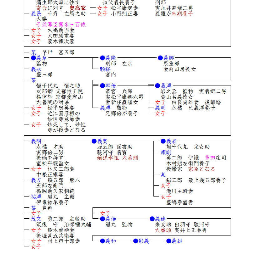 義春の遺跡は三男義真(ざね)が継ぎ、3120石余の采地を賜い、義真の子・義里の代には奥高家となりました。以後、義寧・義紀・義宣・義勇と奥高家を務め、義真・義宣は高家肝煎を務め、維新まで続きました。