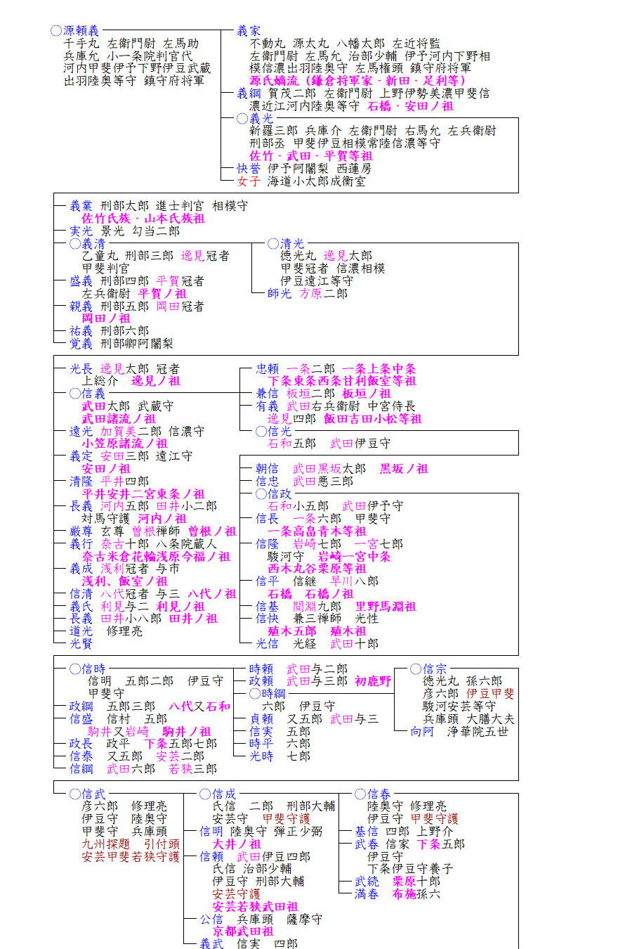 義光の子は義業が常陸佐竹氏の祖に、盛義が信濃平賀氏の祖、そして義清が甲斐源氏の祖となりました。義清は初め常陸国吉田郡武田郷に住し武田冠者と呼ばれていましたが、土地の豪族吉田氏との抗争に敗れ、息子清光と共に甲斐国市川荘に配流となりました。義清は、やがて市川荘の荘官となって土着し、その子孫は甲斐国内に広がり甲斐源氏と呼ばれるようになりました。