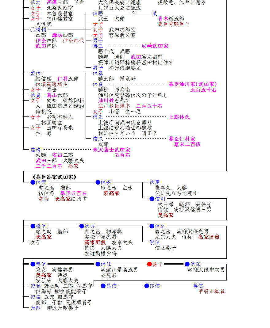 しかし、その後も生き残った武田氏の血統は意外に多く、現在まで続いています。その中でも嫡流と目されているのが信玄の二男・海野龍芳(信親)の子孫高家武田家です。龍芳自身は武田氏滅亡の際に自刃して果てていますが、一子・信道を逃れさせ、信玄の御伽衆の一人であった長延寺実了という僧侶に預けました。信道は長じて出家し顕了道快と称し、師の跡を継ぎ長延寺の住持となり、武田の遺臣である大久保長安の庇護を受けていました。しかし慶長19年(1614)長安の没後、生前の不正行為や謀反の疑いでその一族等が罰せられると、顕了道快も連座し、息子信正等と伊豆大島に配流されてしまいました。