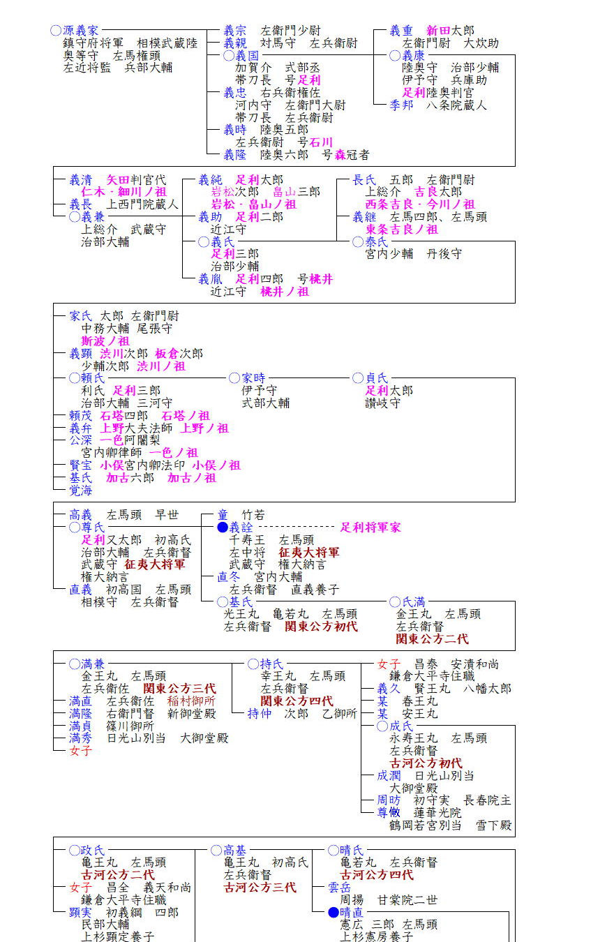 宮原家は、足利将軍家初代・尊氏の末子・基氏を祖とする関東公方家に始まります。足利尊氏は関東の押さえとして、初めに弟の直義、ついで長男の義詮を鎌倉府の主としましたが、貞和5(1349)年次男基氏を義詮と交代させ、以後基氏の子孫が相承しました。しかし四代持氏は六代将軍義教と対立し、永享の乱で関東公方は一時断絶することになりました。