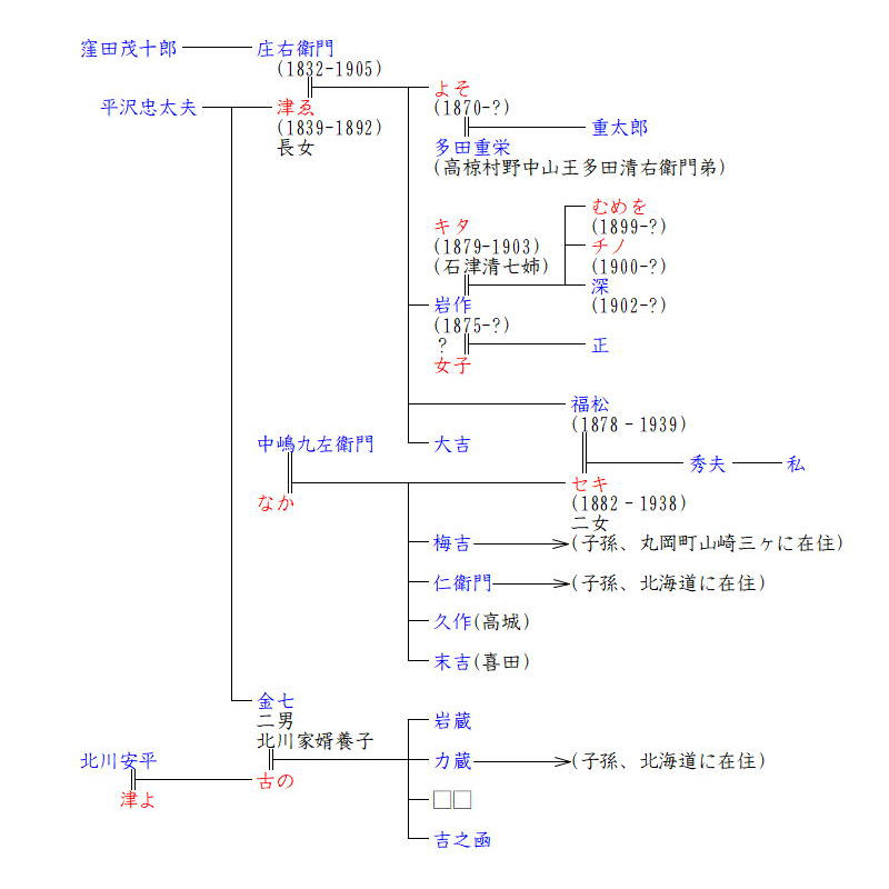 ところが、以前父母にもらった実家の自治会の開基100年記念史(巻末に「家族紹介」として各家族の家史・家系が載っている。)をぱらぱらとめくっていたところ、北川金七さんの経歴の所に「平沢忠太夫の二男として出生」し、同郷の北川家の婿養子となると書かれていたのです。平沢忠太夫といえば、私の曾祖母津ゑの父親です。つまり、金七さんと津ゑは兄弟で、祖父の福松にとっては伯父(叔父?)というわけです。
