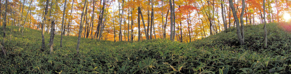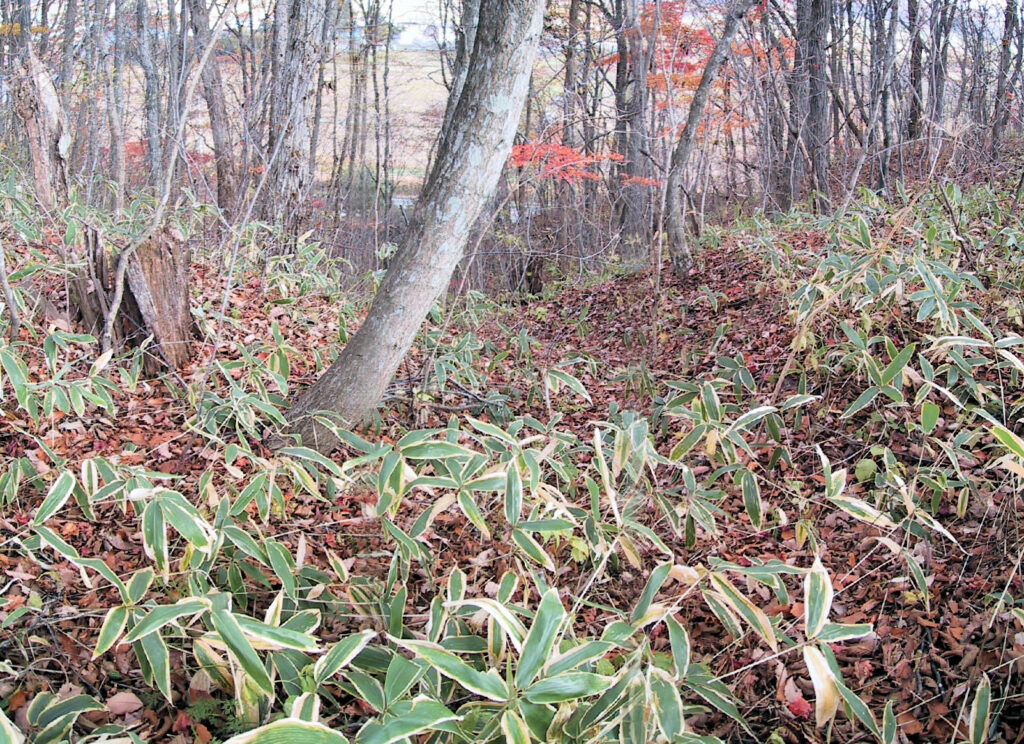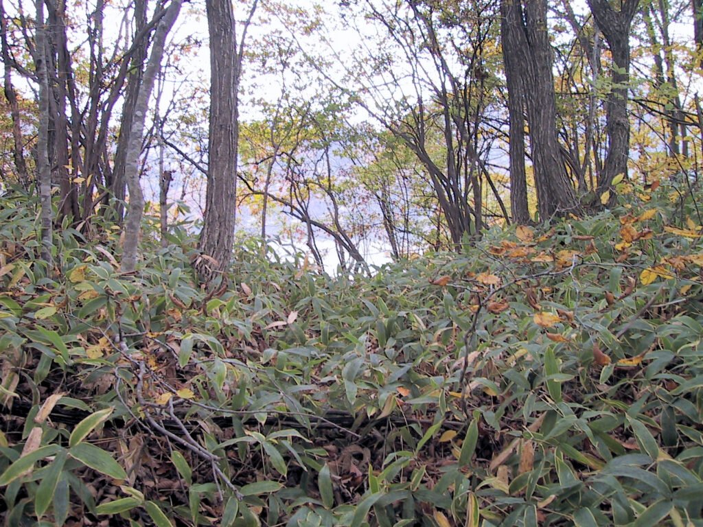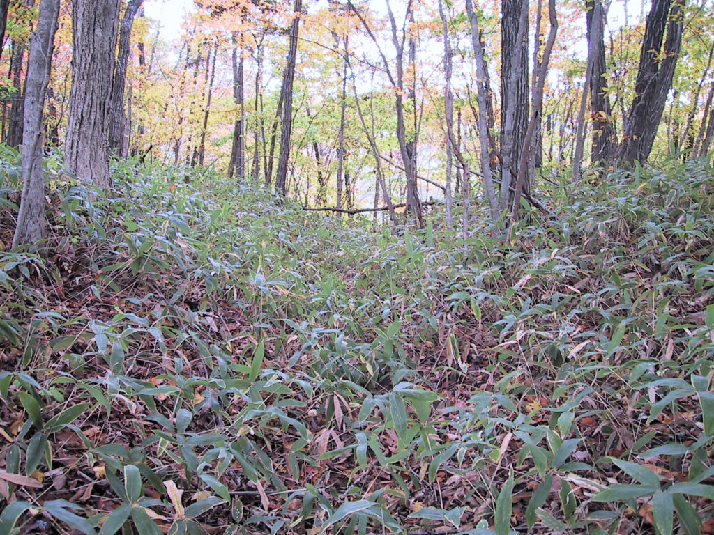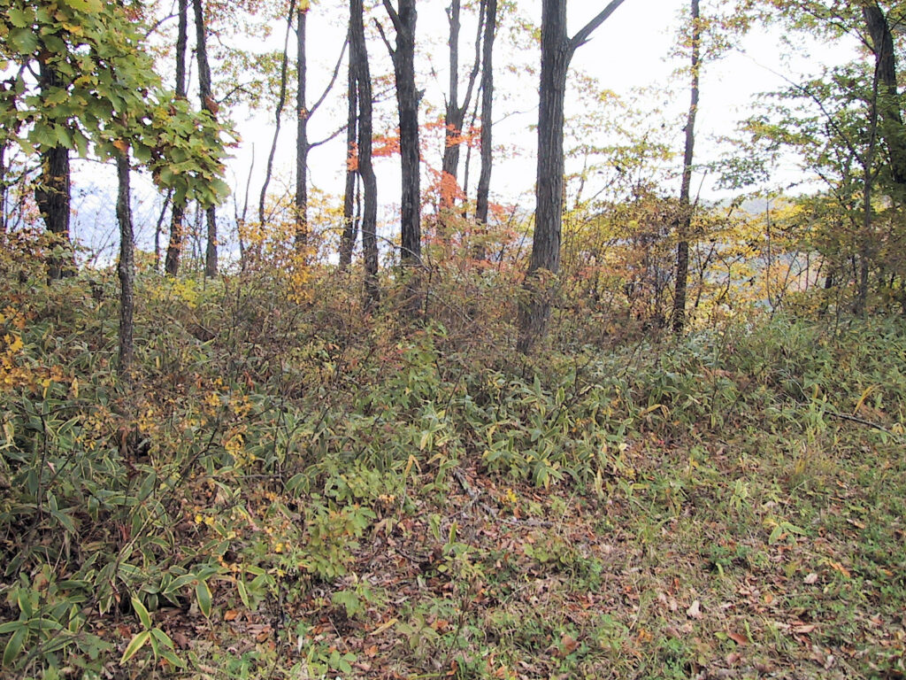 ポンカンカンチャシを訪れるのは二年ぶりです。前回はあとから四条ある壕のうち一条を見落としたことにあとから気付きましたが、今回はそれを確認するのが第一目的でした。前回と同じく笹藪に入りしばらく行くと第四の壕がありました。この壕は四本のうち一番大きくわかりやすいものですが、それからしばらく行くと若干窪んでいるように感じられるところがありました。その丁度中央の部分は何か工事をしたような感じで盛り上がっていましたが、どうもこれが第三の壕のようです(^^;) その先にある二条の壕もすぐ見つけられましたし、この壕は他のものに比べると浅くちょっとわかりにくいです。(2001/10/14)