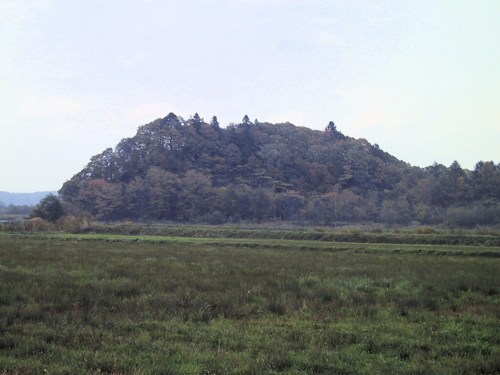 開拓記念館のバス見学会「沙流川沿いのチャシをめぐる」で最後に訪れたのが平取町字貫気別にあるニオイチャシです。ここは40年ほど前に早稲田大学によって発掘が行われており、鉄鍋・鉈・鍬・煙管・マキリなどが出土しているそうです。舌状台地の先端部分ですが、一見すると独立丘のように見え、とても目立ちます。比高は30mほどあるそうで、近くまで行って下から眺めただけですが、やはり壕があるようです。ちょっと登ってみたい衝動にも駆られましたが我慢しました(^^;)