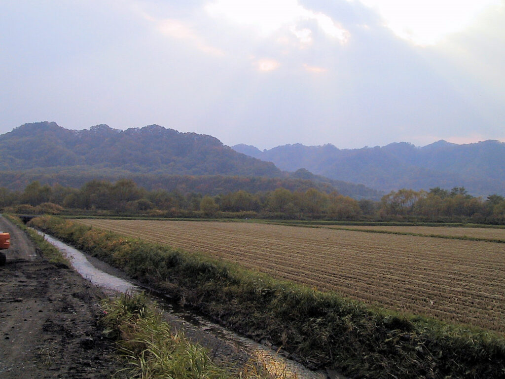 このニナツミチャシも二年前周囲を探してみましたが、よくわからなかったところです。前回はもっと東側を見ていましたが、今回は道路がカーブしていて一番沙流川に近い所にある牧草地の端の所を見てみたら、丁度先端が三角形になっていて、その基部が若干窪んでいるように感じられるところがありました。はっきりとはわかりませんが、これがニナツミチャシなのかなと自分なりに結論づけましたが、あまり自信はありません(^^;)