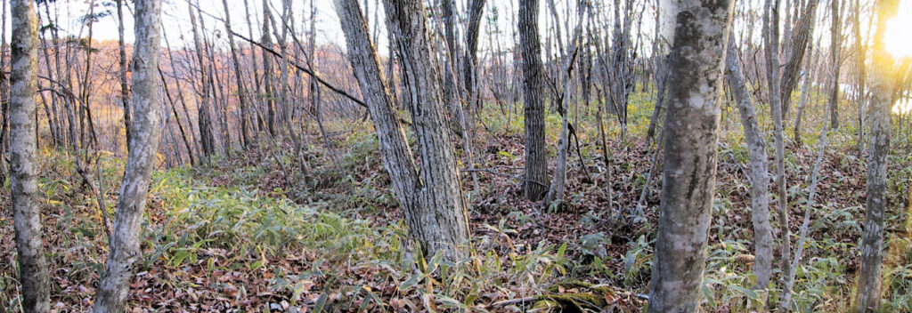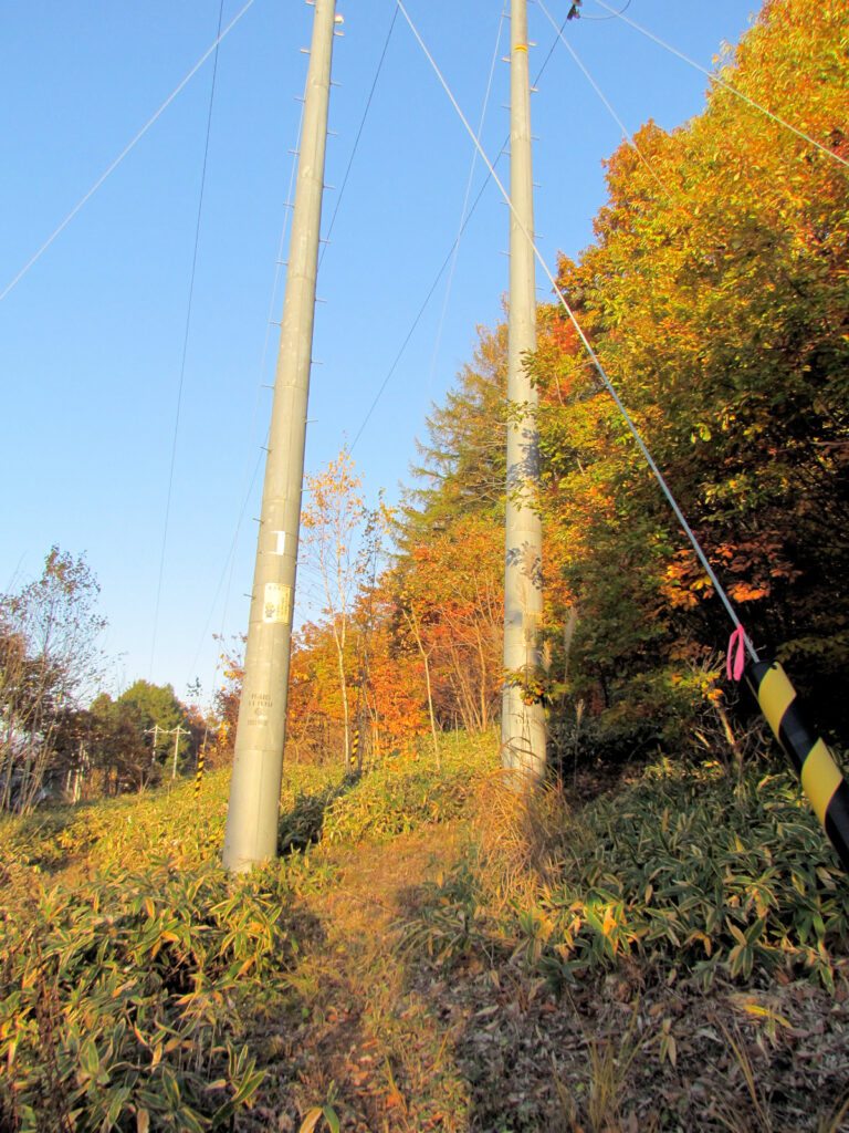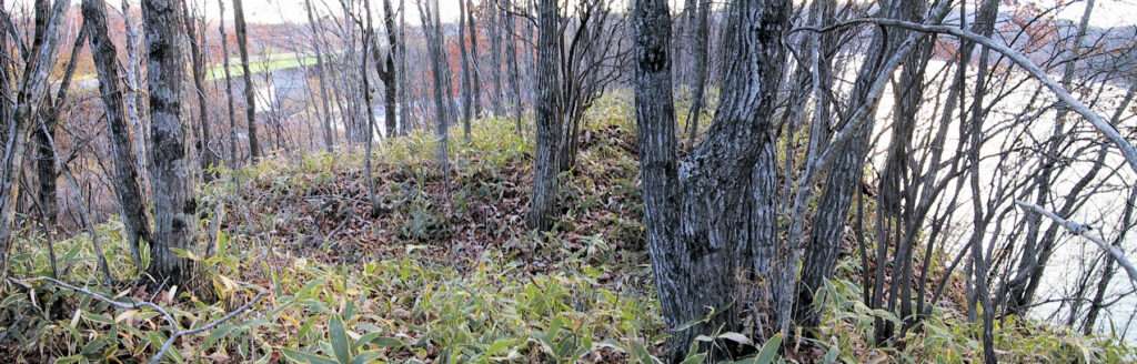 NACKさんの情報の通り、電柱のある辺りから右側の尾根に出て、尾根沿いに進む(ちょっと細くて恐かったですが)と平坦部に出て、しばらく進むと広い壕がありました。深さは2mくらいはあるでしょうか。幅がかなり広くて、10mくらいはあるかもしれません。宇田川洋氏の『アイヌ考古学研究・序論』に載っている平面図によると、手前の方にももう一本小さな壕があるように書かれていますが、若干窪んでいるように感じるところはあったものの、よくわかりませんでした。
