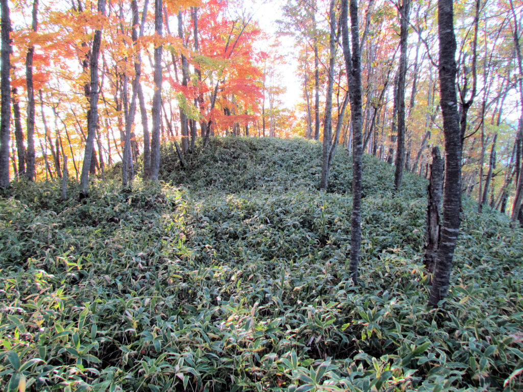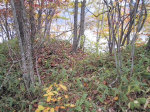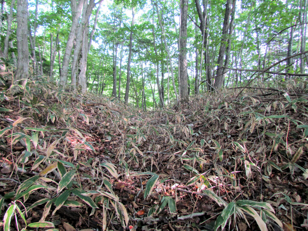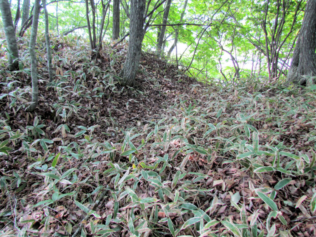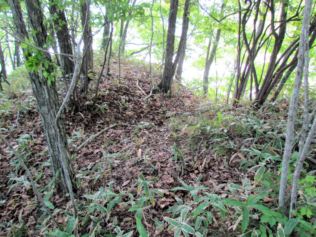 駐車場の少し先に左に下る道があったのでそちらへと曲がり、チャシの方を眺めてみましたが、笹藪に覆われているようでしたので止めようかなとも思いましたが、登ってみると笹の丈が意外と低く歩けそうでしたので、チャシの先端へと進みました。するとすぐに一本目の壕を見つけました。幅は2~3mで深さは1mほどでしょうか、長さは10mぐらいあったかもしれません。