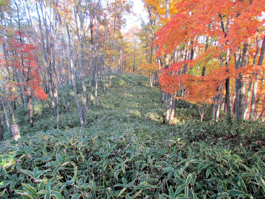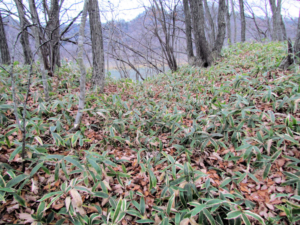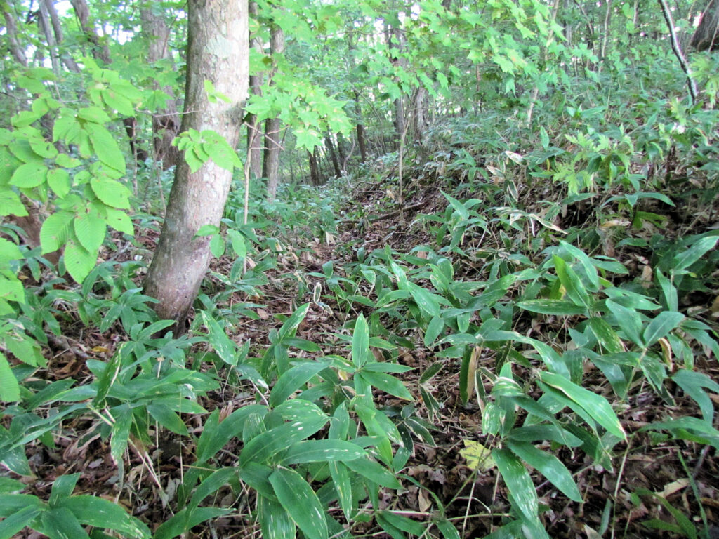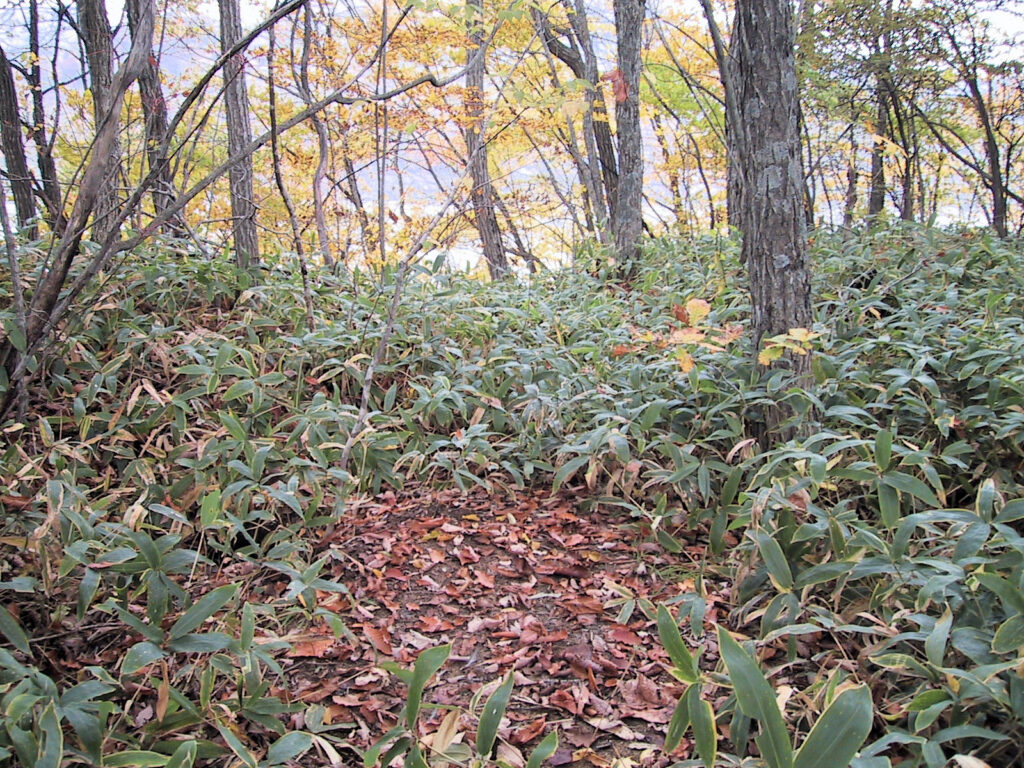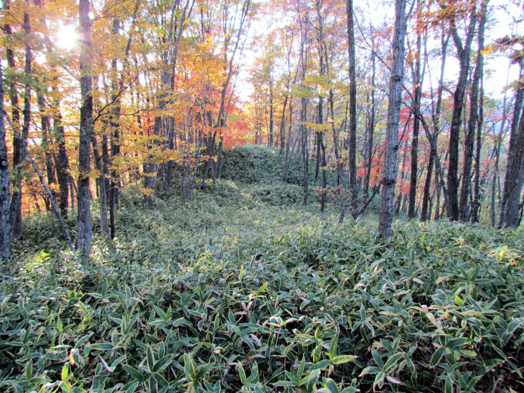 駐車場の少し先に左に下る道があったのでそちらへと曲がり、チャシの方を眺めてみましたが、笹藪に覆われているようでしたので止めようかなとも思いましたが、登ってみると笹の丈が意外と低く歩けそうでしたので、チャシの先端へと進みました。するとすぐに一本目の壕を見つけました。幅は2~3mで深さは1mほどでしょうか、長さは10mぐらいあったかもしれません。