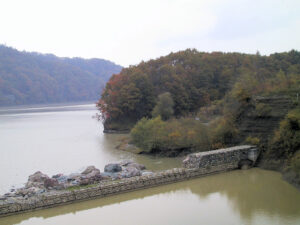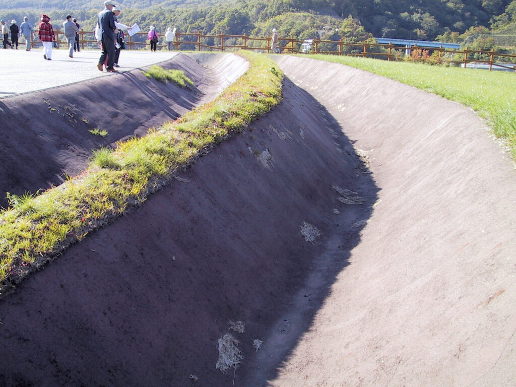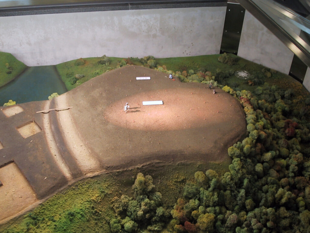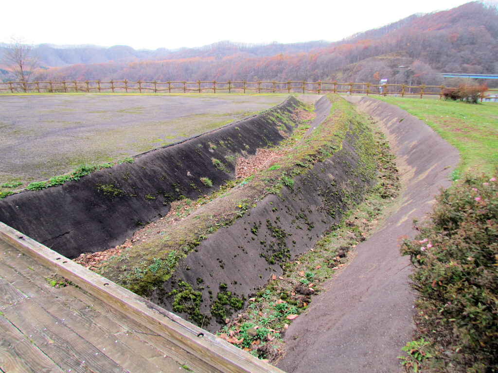 私はダム建設によって破壊されたと勘違いしていたんですが、そうではなく、ダム建設以前にすでに畑にするために壕の部分も含めて削平されており、ダム建設の前に調査のため発掘してみると畑の端の方に壕跡が残って、二重の壕があったことがわかったそうです。(畑になっていたため遺物自体は少なかったそうです)
