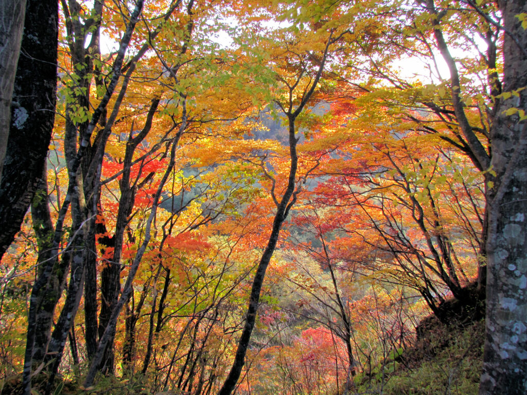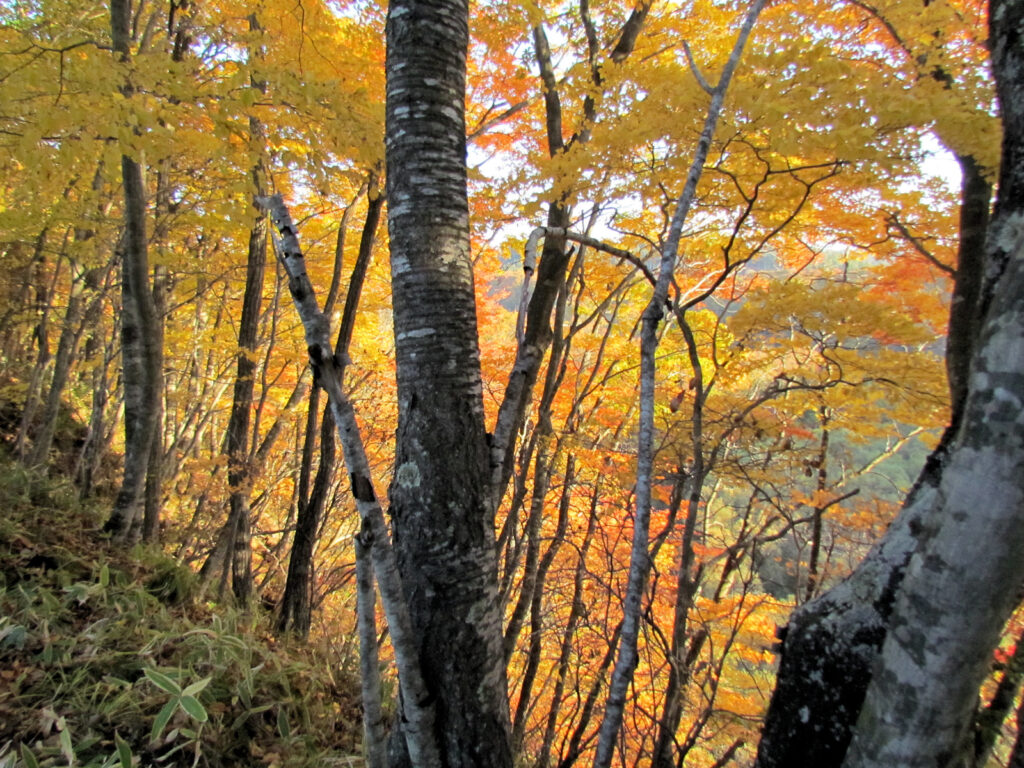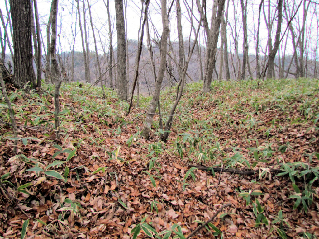 道路の右側は少し草地が広がっていて、奥の方に樹木がありますが、その切れ目の辺りに壕がありました。とはいってもそんなに深いものではなく、深さは数10cm、幅も1m程度のものです。枯れ葉で埋まっているので、ホントはもう少し深いのでしょうけど...