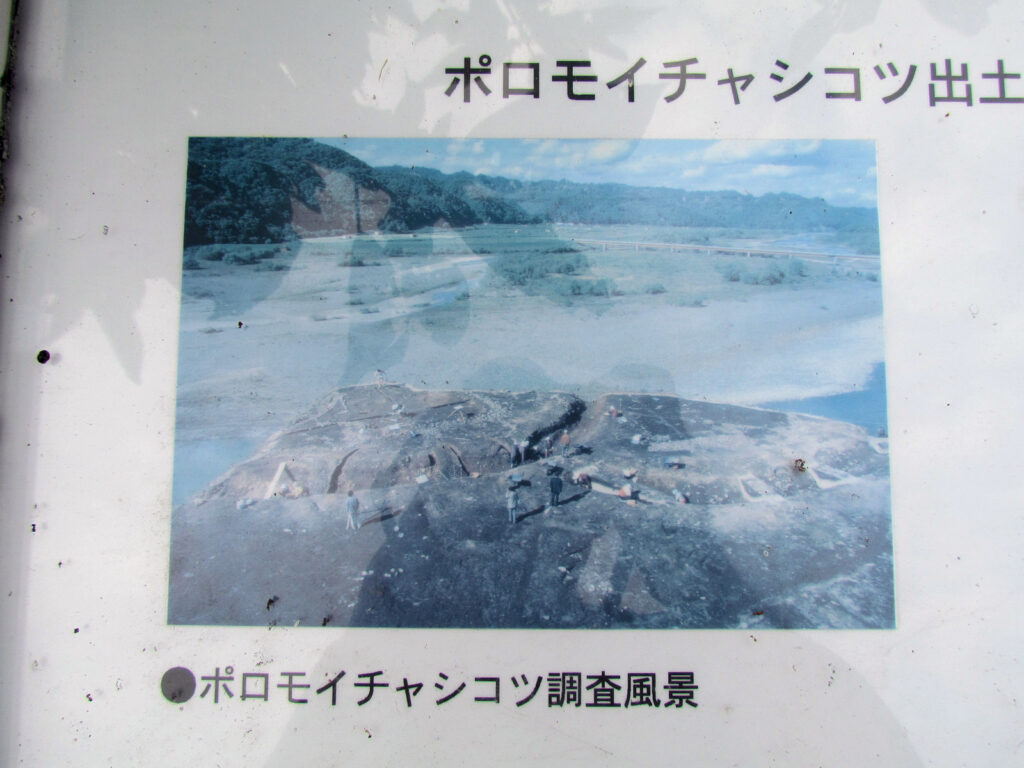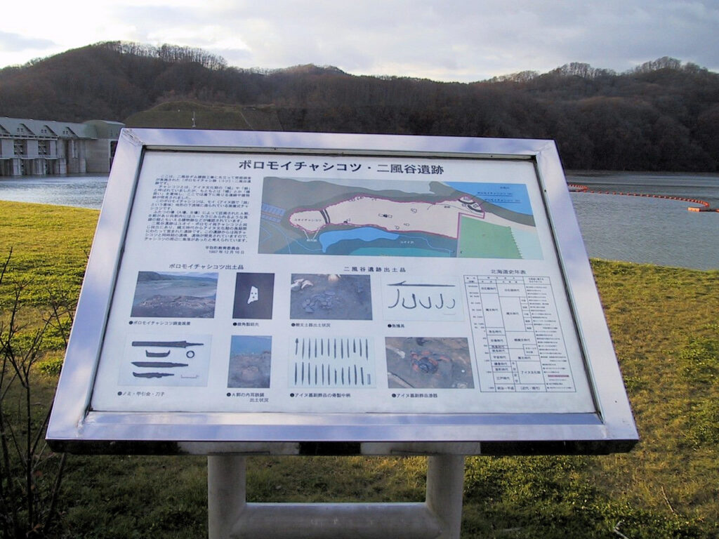 このポロモイチャシもユオイチャシと同じくダム建設のために消滅したチャシです。かつては現在ダムの管理事務所などがある辺りに二風谷遺跡があり、その両端にユオイチャシ・ポロモイチャシの2つのチャシ跡がありました。ダムが建設される前にこの2つのチャシは全面発掘されていまして、アイヌ文化博物館のすぐ右にある沙流川歴史館ではこのユオイチャシ跡・ポロモイチャシ跡と二風谷遺跡の発掘調査の様子がパネルやジオラマでわかりやすく展示してあります。
