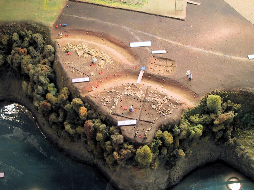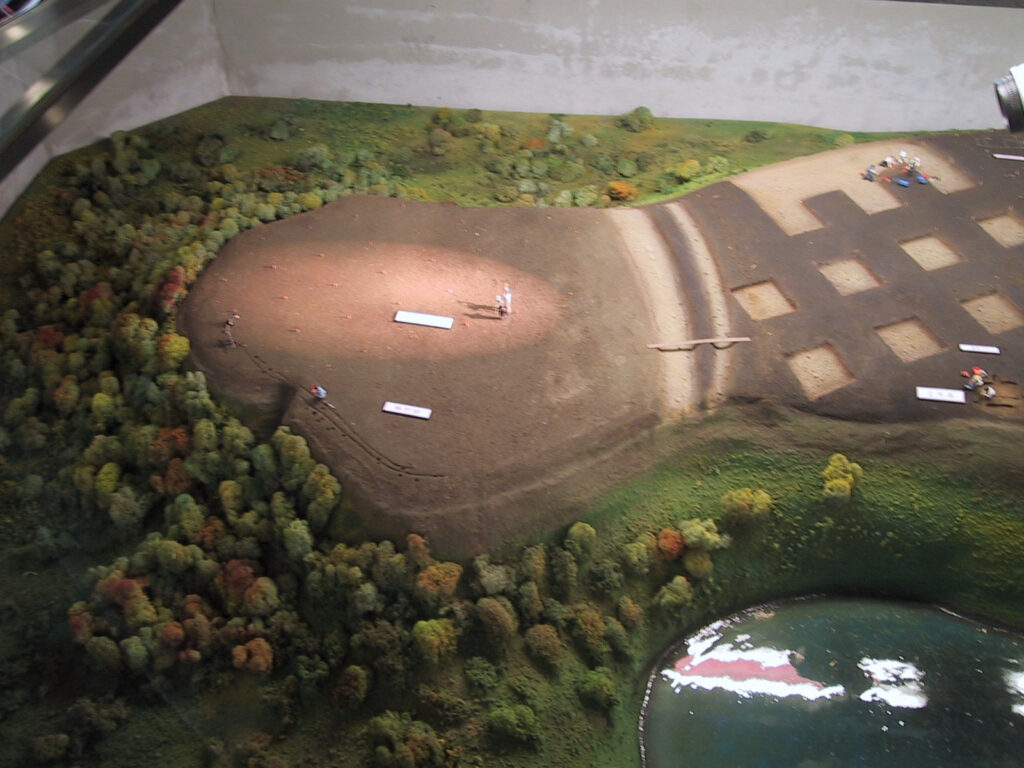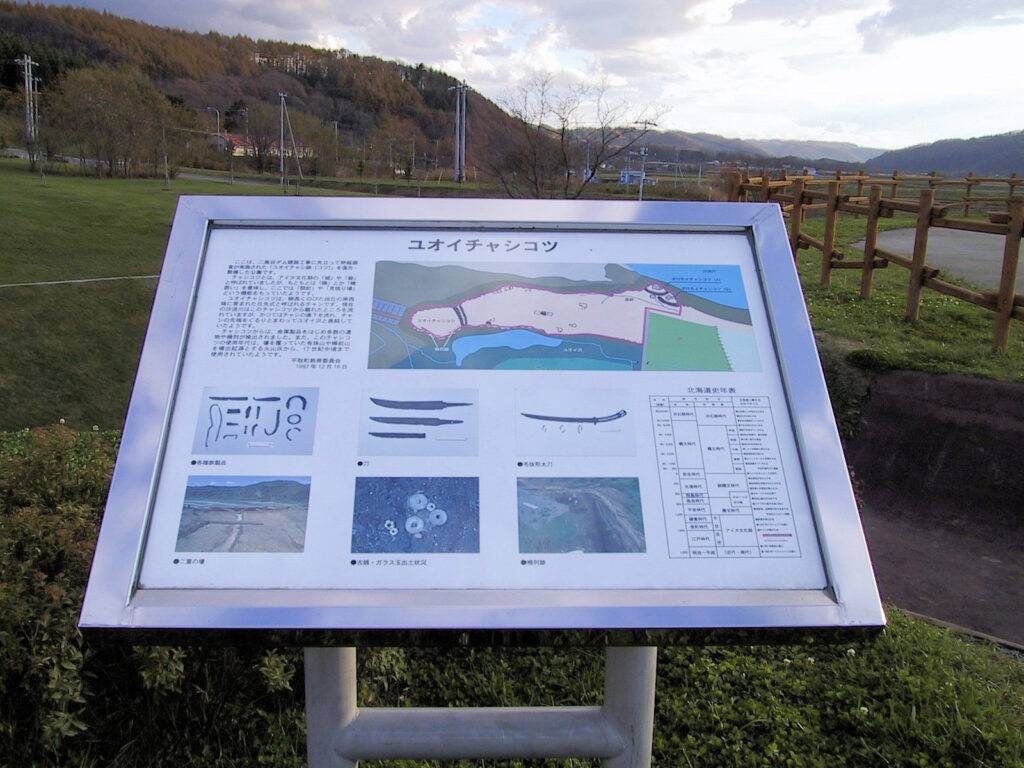 現在はダムができてしまったため、すっかり様子が変わってしまいましたが、かつては現在ダムの管理事務所などがある辺りに二風谷遺跡があり、その両端にユオイチャシ・ポロモイチャシの2つのチャシ跡がありました。ダムが建設される前にこの2つのチャシは全面発掘されていまして、アイヌ文化博物館のすぐ右にある沙流川歴史館ではこのユオイチャシ跡・ポロモイチャシ跡とその間にあった二風谷遺跡の発掘調査の様子がパネルやジオラマでわかりやすく展示してあります。ユオイチャシは二風谷遺跡の西側(川に向かって左側)にあり、川に突き出た段丘先端部に位置し二条の空壕がありました。