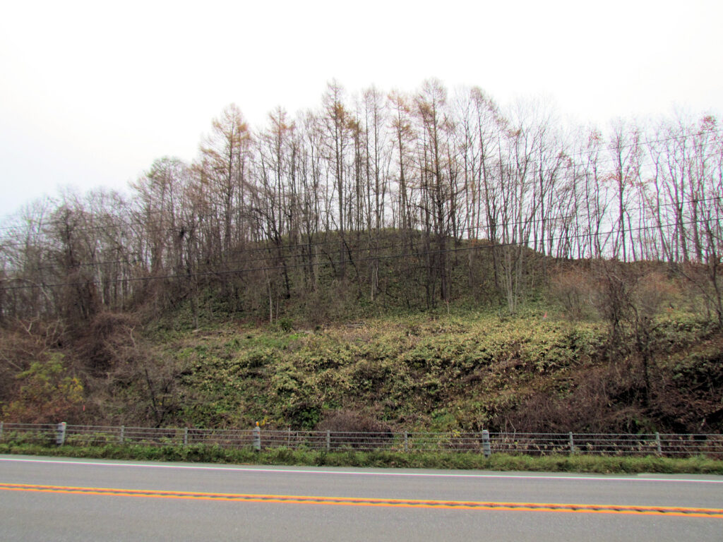 まず開通したばかりの道東道でむかわ穂別ICまで行き、そこから南下して穂別中心部へ向かい、5つのチャシを回りました。そのあとは、平取に向かいました。最初にユオイチャシを見たあと、次はポンカンカンチャシに向かいました。ポンカンカンチャシと道路を挟んで向かいのシラッチセチャシには登らず、道路側から全景写真を撮っただけでした。(2011/11/06)