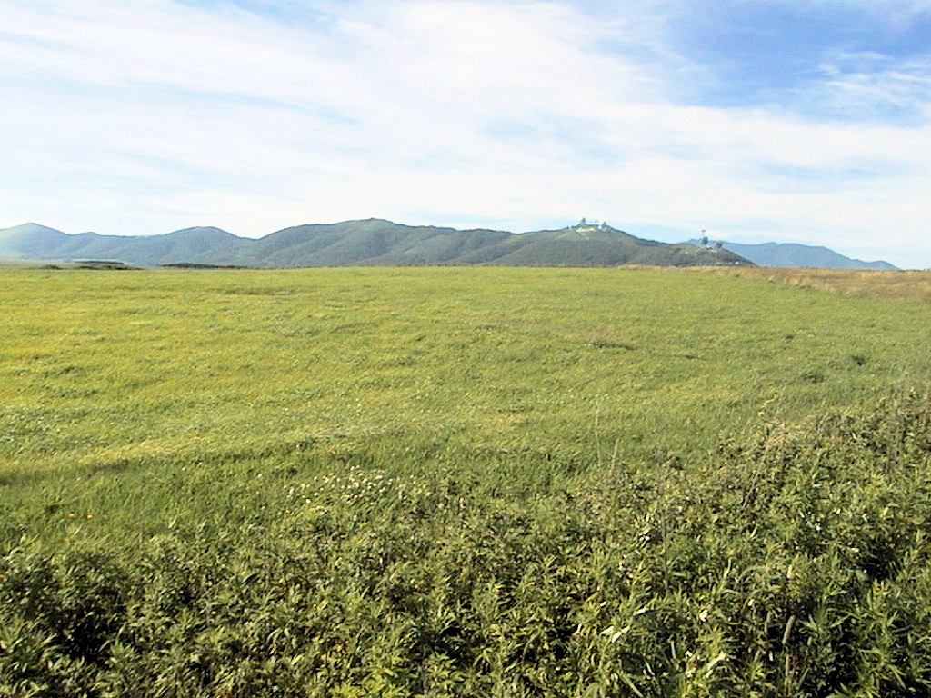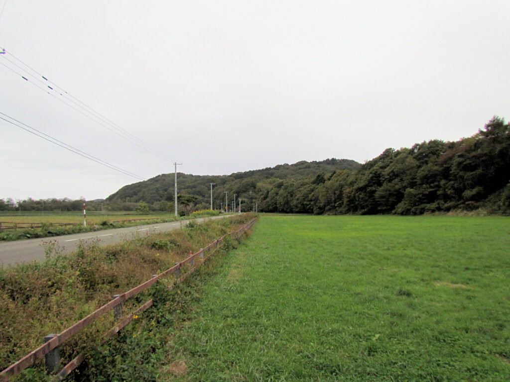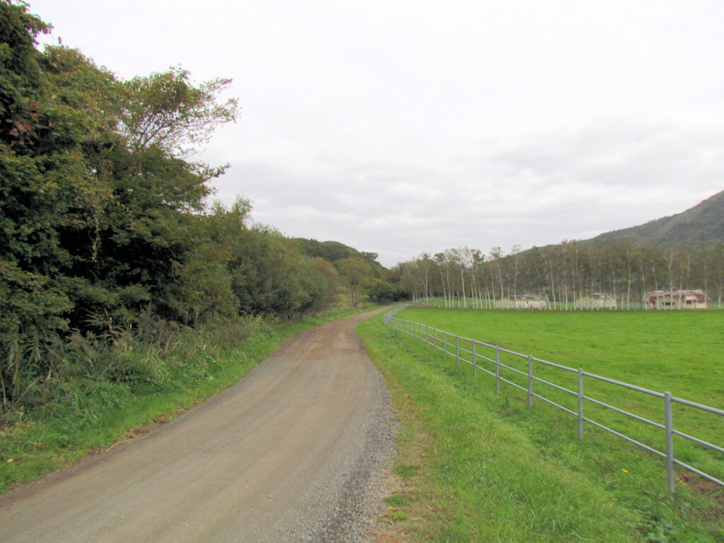 実はチャシをなかなか見つけられずこの道を何度も往復してしまいました(^^;)というのもこのチャシの遺構として壕と土塁があるんですが、この高さも深さも数10cmで一見するとただの草原にしか見えないんです。よく見るとちょっと窪んでいるのがわかるんですが、知らない人が見たら何も気がつかないでしょう。
