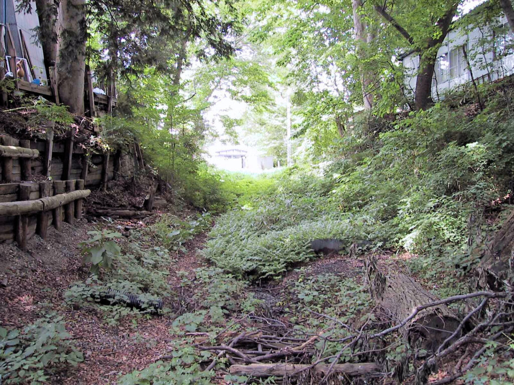 本丸を見た後、杉坂さんおすすめの本丸裏の土塁・空堀を見に行きましたが、正直な話、復元された本丸よりはこちらの方が私は印象に残りました。本丸の裏手にある土塁は、高さ4~5mくらいはありそうで、さすがに本丸よりは低い位置にありましたが、かなり大きいです。またそれにつながる空堀も大きく本丸と国道との間の堀はそこの方に水が溜まっており、水堀だったのかもしれませんと杉坂さんに教えていただきました。