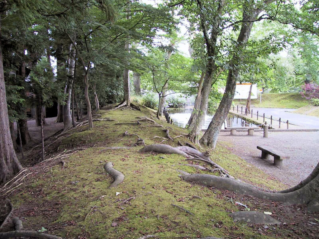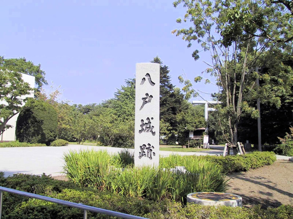 まず八戸城ですが、ここは現在三八城(みやぎ)公園となっており、遺構らしいものはあまりありません。本丸跡の標柱があったのと、三八城神社の裏手に土塁が残っているくらいでしょう。この土塁は20mほど残っており、鬱蒼と木が生えておりかつての八戸城を偲ばせます。