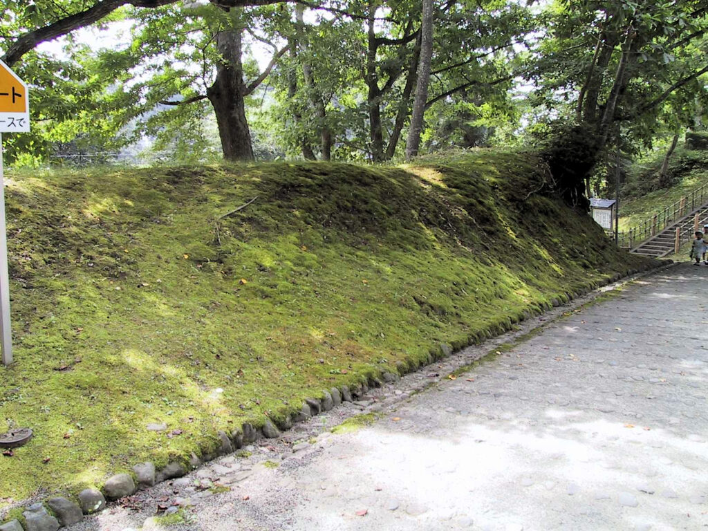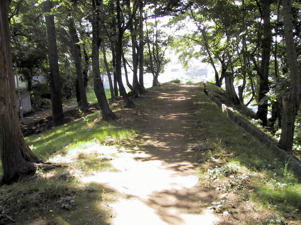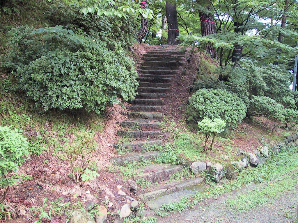 しかし、その遊歩道は砂利道で、雨のために歩きにくくなっているし、周りを見回しても「こりゃあ土塁とか堀くらいしか遺構はなさそうだな」と判断、自分一人だったら上まで登りますが、嫁さんも一緒だったので引き返そうとすると、嫁さんが「いいよ、行ってみよう」というもので、結局本丸まで登ってしまいました。