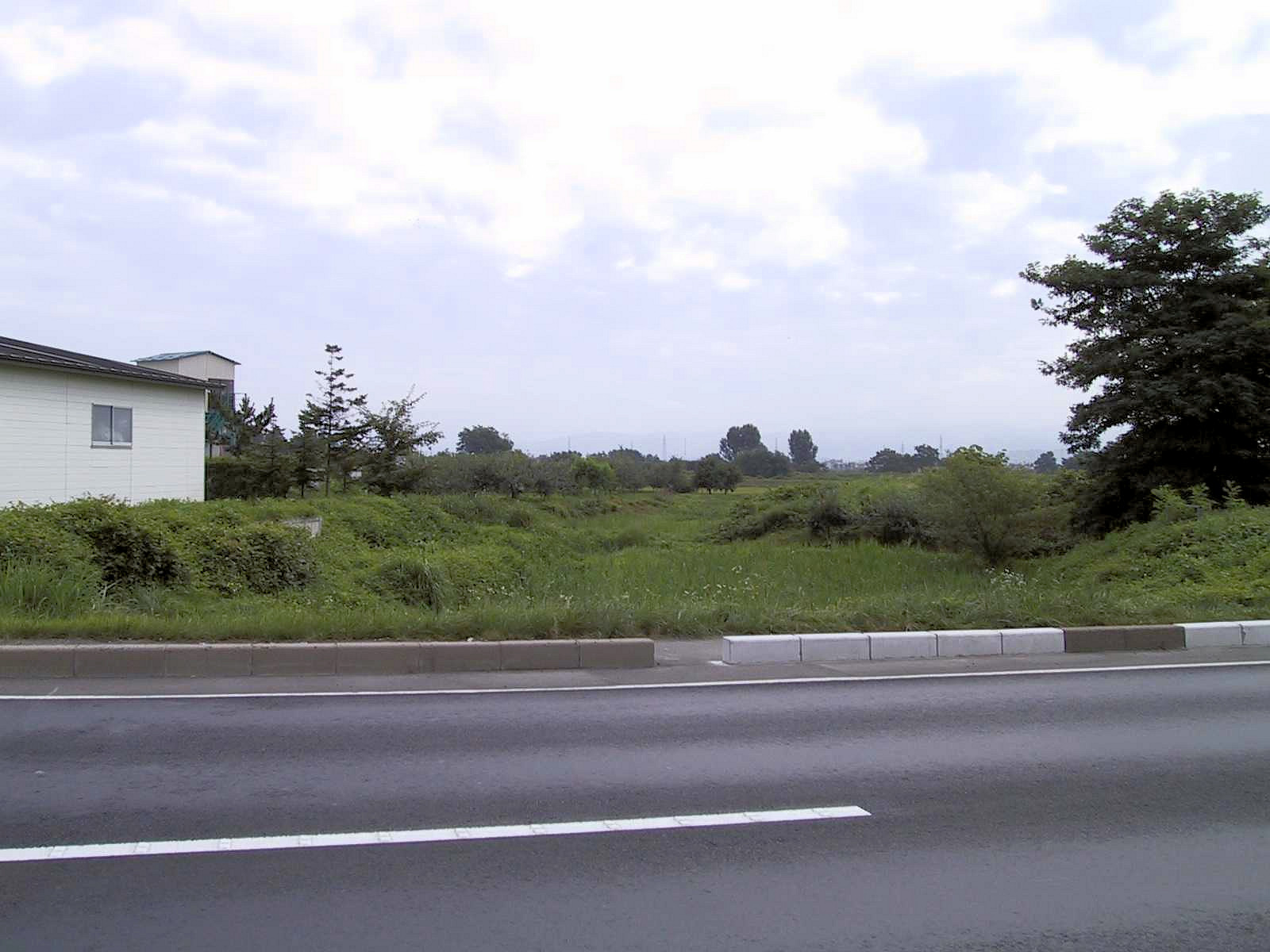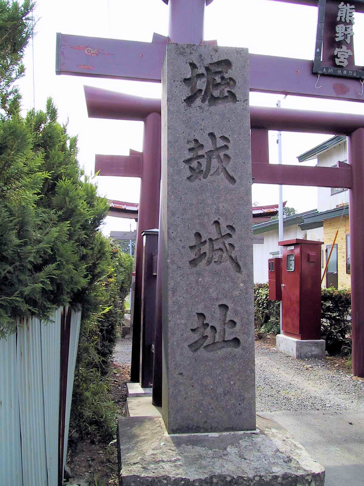 そのあと少し離れたところから見てみようと思い、城跡の横を通っている国道7号線の方に移動してみました。この国道は、丁度二の丸部分を貫通しており、遺構が破壊されています。国道側から見ると、本丸部分が内堀に囲まれているのがよくわかります。また熊野宮の鳥居と本丸の間に窪んだ部分がありましたが、ここが外堀のようです。国道の向かい側にもこの外堀跡が続いていましたので、本来の城域はかなり広かったものと思われます。現在は熊野宮の境内となっている本丸以外は水田や畑などになっているようで、かつては津軽氏の本城として栄えた堀越城を想像させるものは本丸の土塁、内堀・外堀跡ぐらいしかないようです。