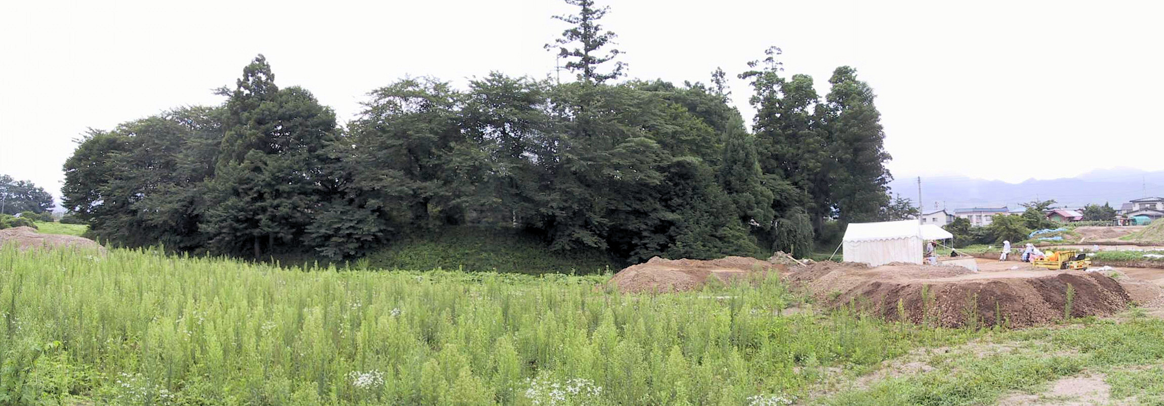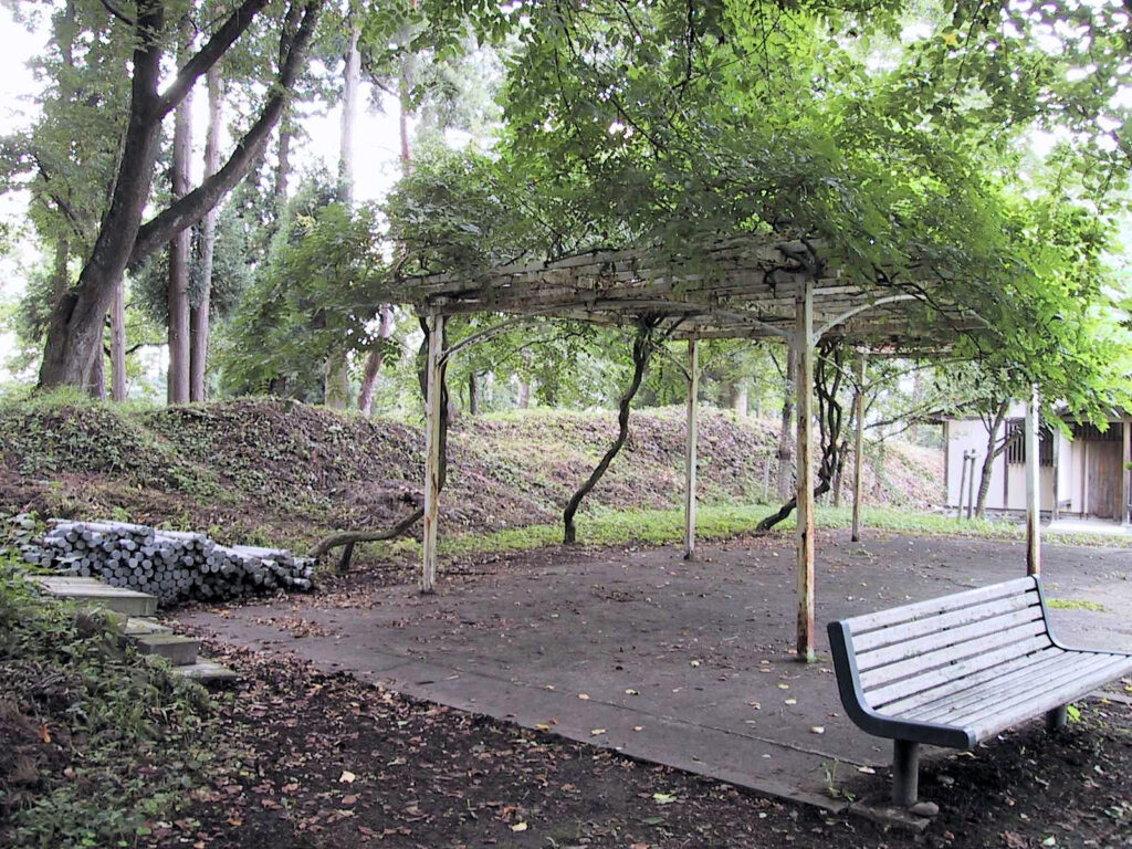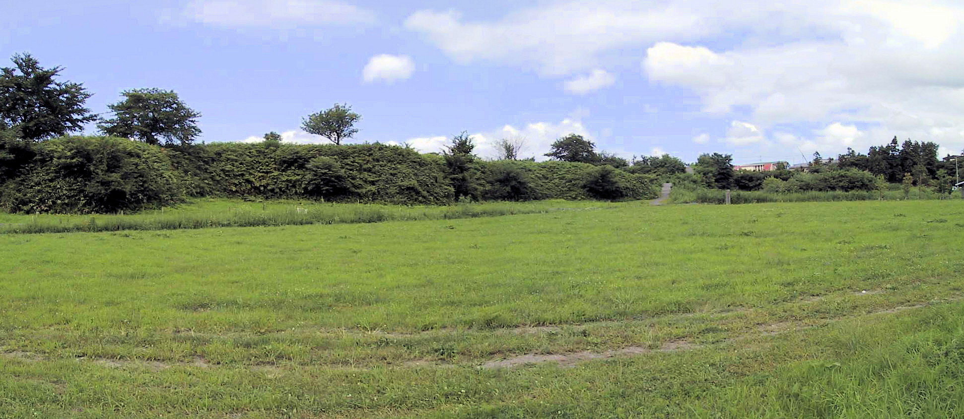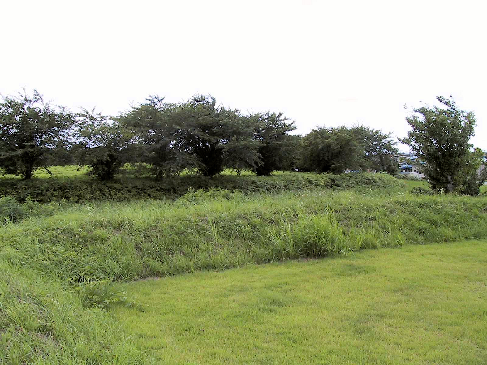 それからいよいよ浪岡城へ。ただ着いたのが丁度昼過ぎの一番暑い頃で、タオル片手に歩きました(^^;) 駐車場に車を置くと、「中世の館」でもらったパンフの地図を見ながら、まず東館へ行きました。丁度城跡の部分が周囲よりも高台になっているのがわかりました。東館の真ん中あたりに浪岡城の案内板がありました。しこから西に進むと北館へ。東館と北館の間には中土塁のある二重堀がありますが、夏草が伸びていてちょっとわかりにくかったです。