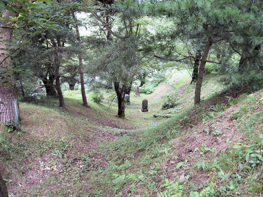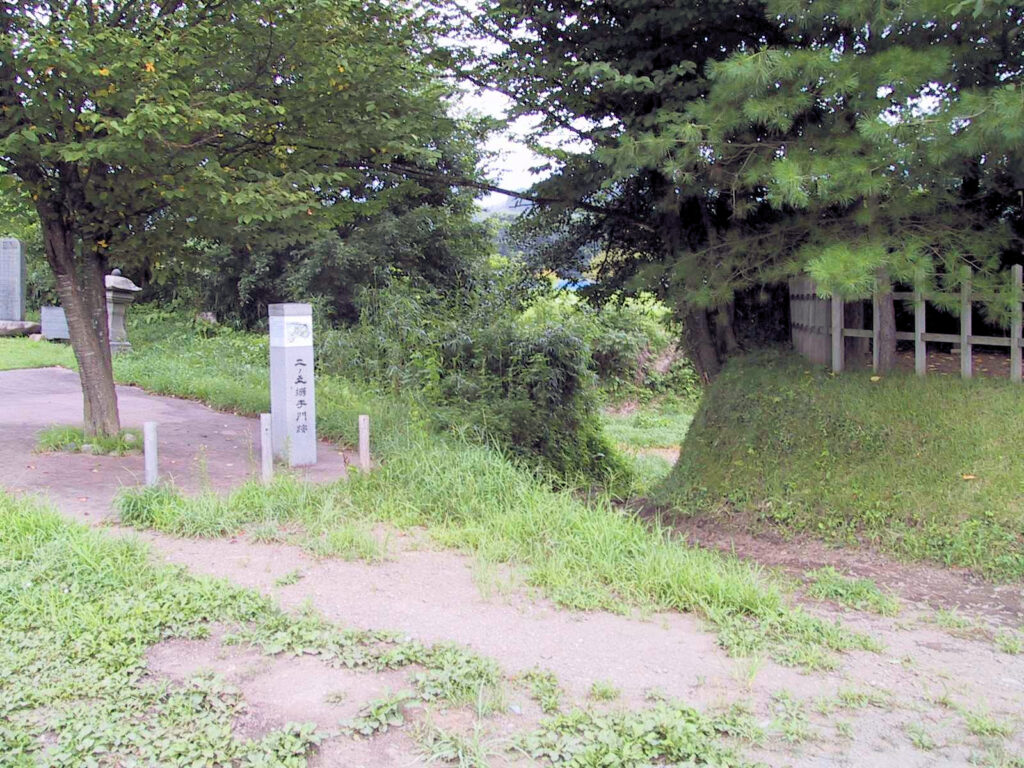 九戸城は二戸市街から少し東側に入った高台にありますが、各郭ごと、あるいは要所要所に説明板がありとても親切です。二戸市街地を北側へ進むと途中に「九戸城跡」の看板があったので、そこで右折し、しばらくすると右側に堀跡の標柱がありました。これは後から見ることにして、もうしばらく先に進むと左側に「九戸城跡」の石柱があったのでその先で左折し駐車場に車を停め、まず二の丸搦手門跡の方に行くと、九戸合戦で亡くなった人たちの慰霊碑がありました。搦手門跡から降りると、その先は石沢館(外館)跡で二の丸との間にかなり大きな空堀がありました。