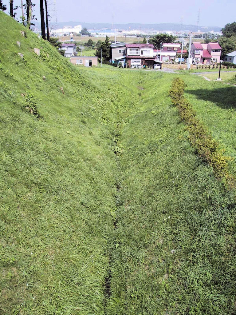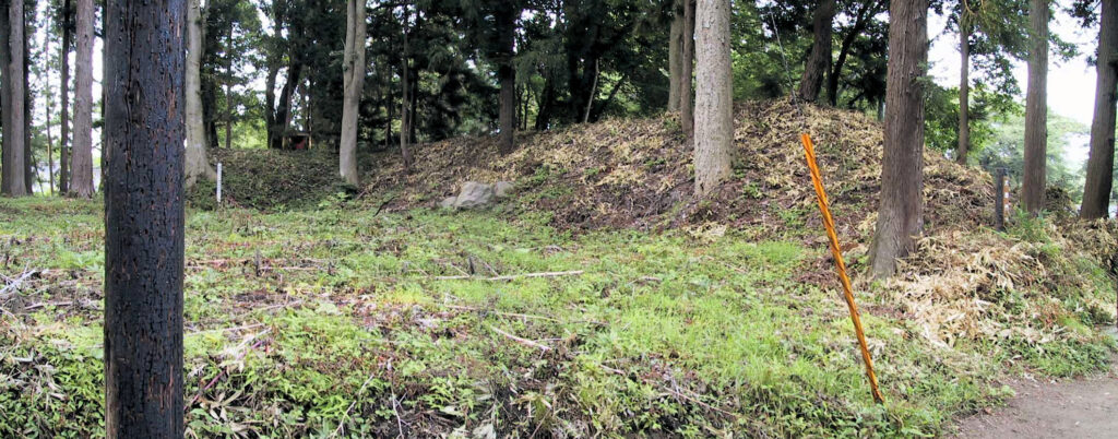 周辺の石沢館・若狭館などは不整形な郭で、いかにも中世の城跡という感じで浪岡城や後から行くことになる八戸根城などを連想させましたが、本丸・二の丸間の堀はきれいにまっすぐに掘られ、本丸はほぼ方形になっており近世城郭の雰囲気が漂っていました。あとから杉坂小弥太さんに、本丸・二の丸はかつては一緒の郭だったのではないかという話を聞きましたが、そう考えると本丸・二の丸を合わせた郭も他の郭と同様不整形なものとなりますし、全体としての雰囲気も浪岡城・根城と似たものになりますので、なるほどなと感じました。たぶん本丸部分は蒲生氏郷による修築時に改造されたものなのでしょう。