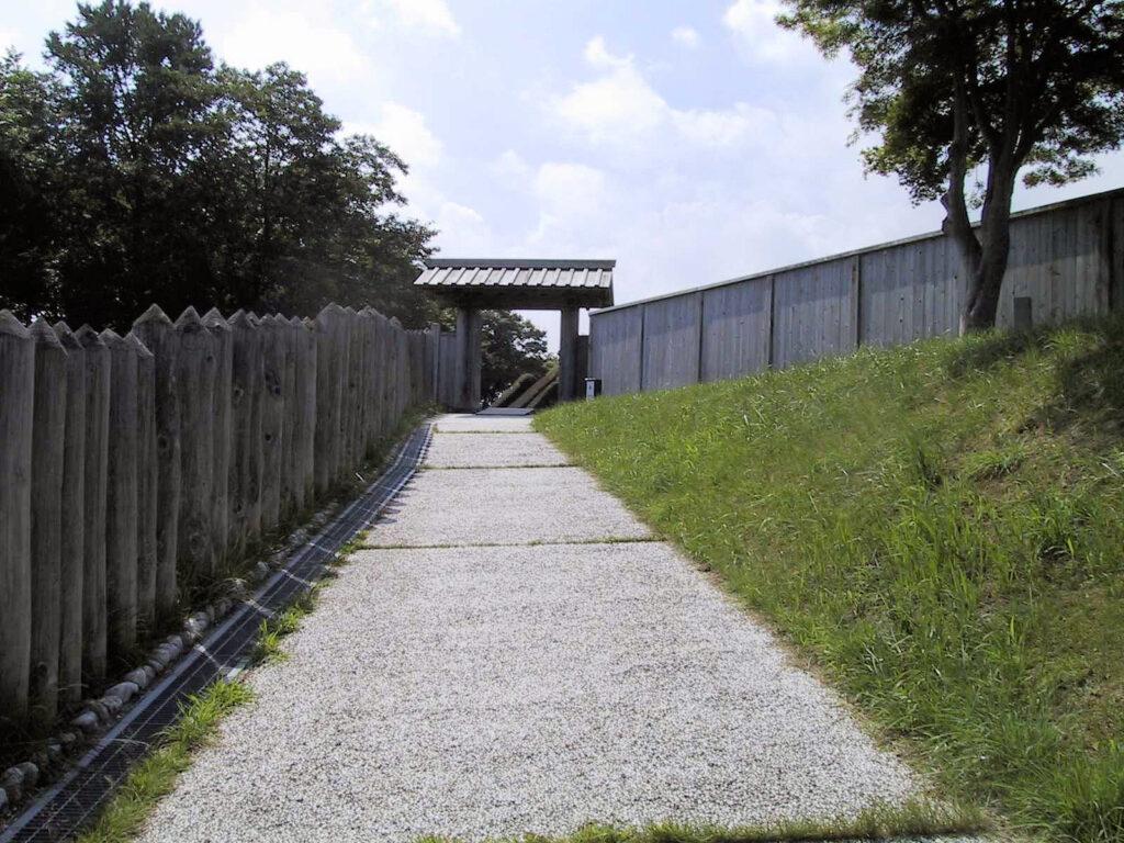 丁度北館の北側の道路に面した方の堀は草刈を始めていましたので、もう少し後に行けば堀の様子も分かったのにとちょっと残念です(^^;) 北館の内部は板塀で仕切られ、建物跡がアスファルトや柱を立てたりして平面復元されていました。北館の南側に行ってみましたが、やはり草が伸びていて内館との間の堀はちょっとわかりにくかったです。