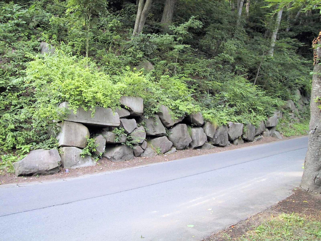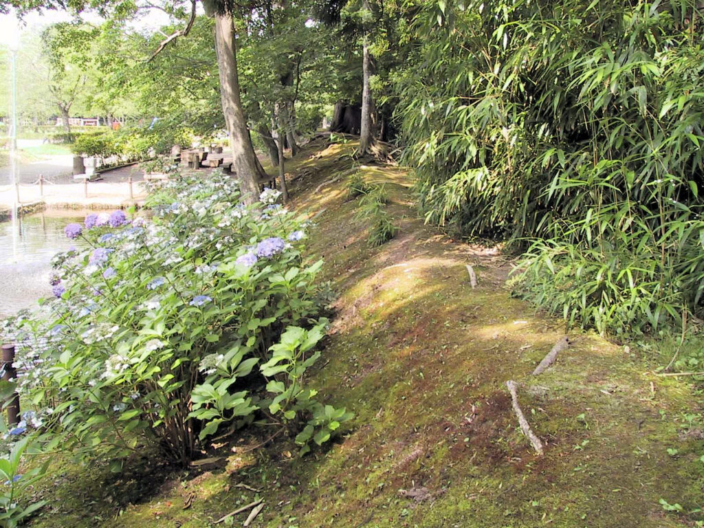 まずはお城近くにある市営地下駐車場に車を停め、歩いて岩手公園方面へと進みました。しばらく進むと、左手に庭園らしきものがありましたが、どうやら堀跡だったようです。後から杉坂小弥太さんにここに、切り出す直前の石垣の石があったと聞き、降りてみれば良かったかなと後悔しました。