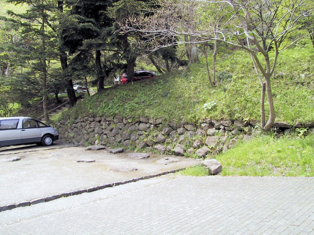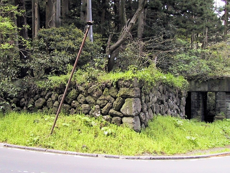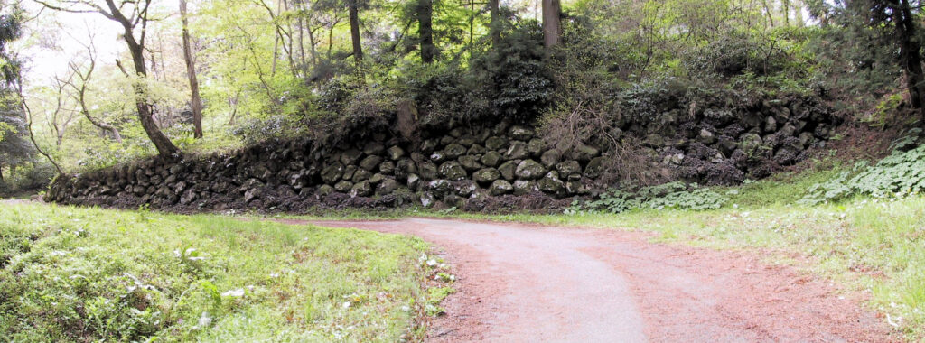 その後は道なりに降りていき途中から三の丸跡(現博物館)へ抜ける道へと折れました。すると、低い石垣を発見しました。仙台市内の本屋で買った『仙台城歴史散策』(宮城文化協会)という本に「追廻口」の石垣と載っていたのがこの石垣のようです。
