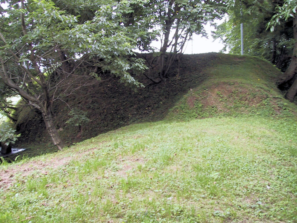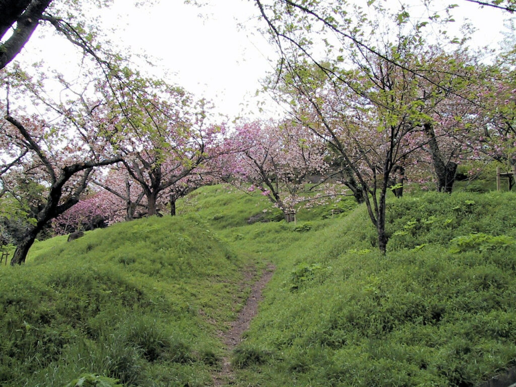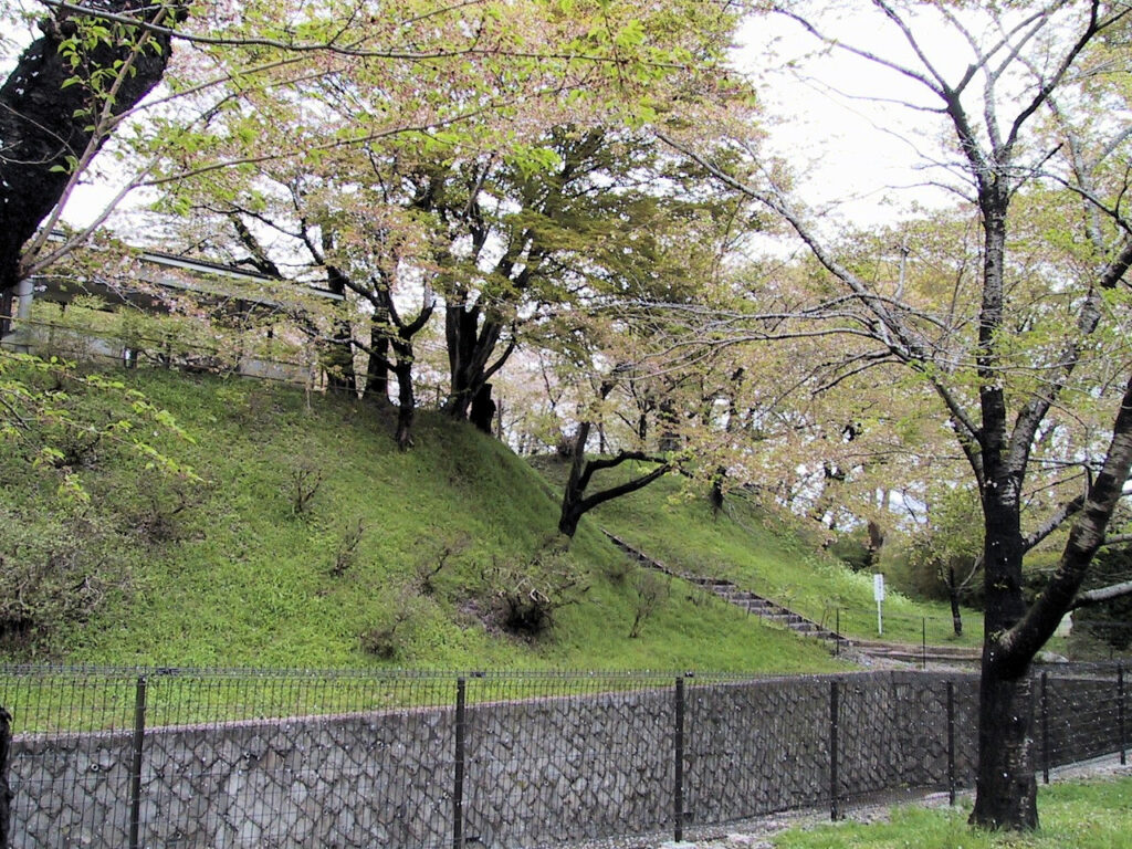その近くに若干盛り上がった土塁のようなものがありました。また、その土塁状のものの外側には少しくぼんだ空堀状のものがありましたが、この二つが遺構かどうかはよくわかりませんでした。先ほどの標柱以外は、説明板のようなものは全く見あたりませんでしたし、一見するとただの公園にしか見えないと思います。