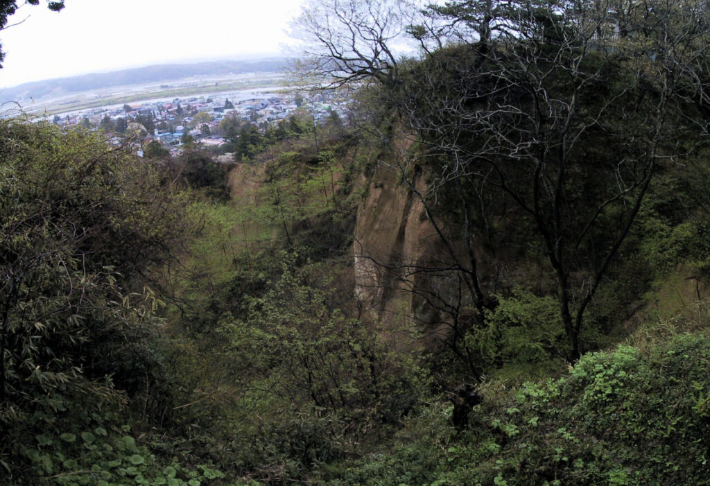 岩出山城の本丸跡は現在は城山公園となり、二の丸は岩出山高校の敷地となっています。まずは本丸の上まで車で上がると案内図があったので、それを見ると北の方に空堀跡があったのでまずはそちらに行ってみることにしました。一度一段下の二の丸跡(?)に降り右の方へしばらく進むと、かなり深い空堀跡がありました。そこから下をのぞくと断崖絶壁で、岩出山城がまさに要害の地に建っているということが実感できました。