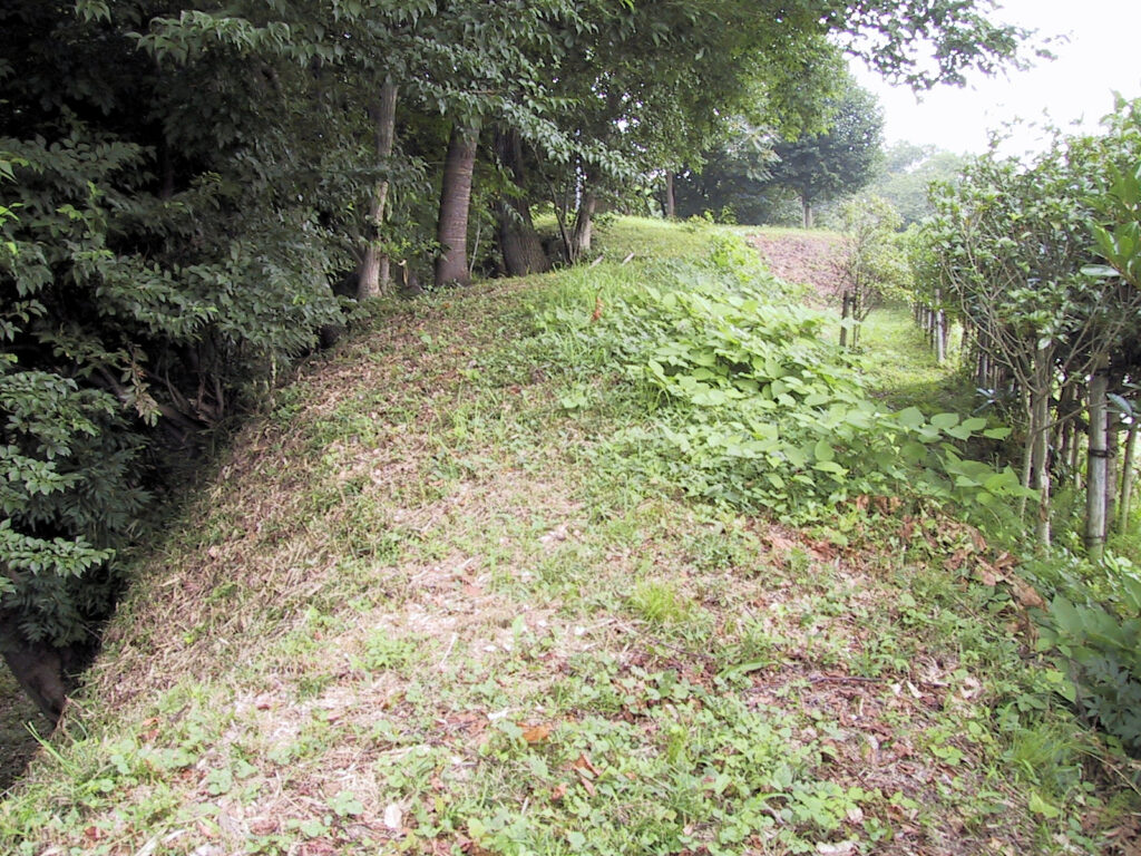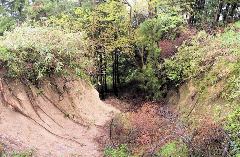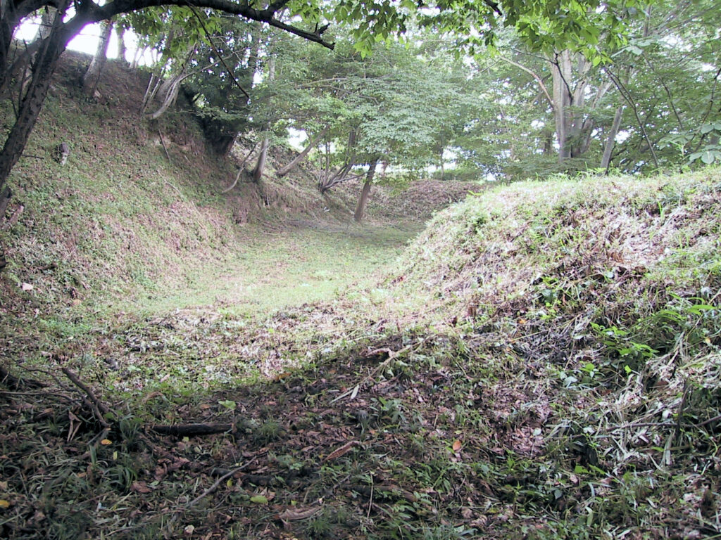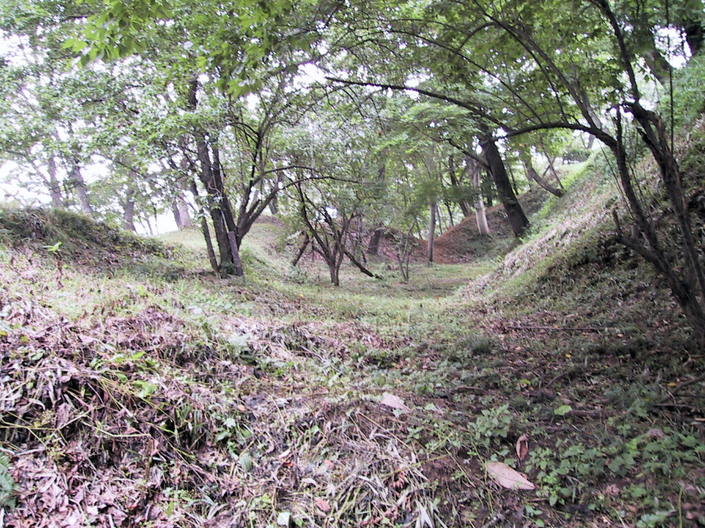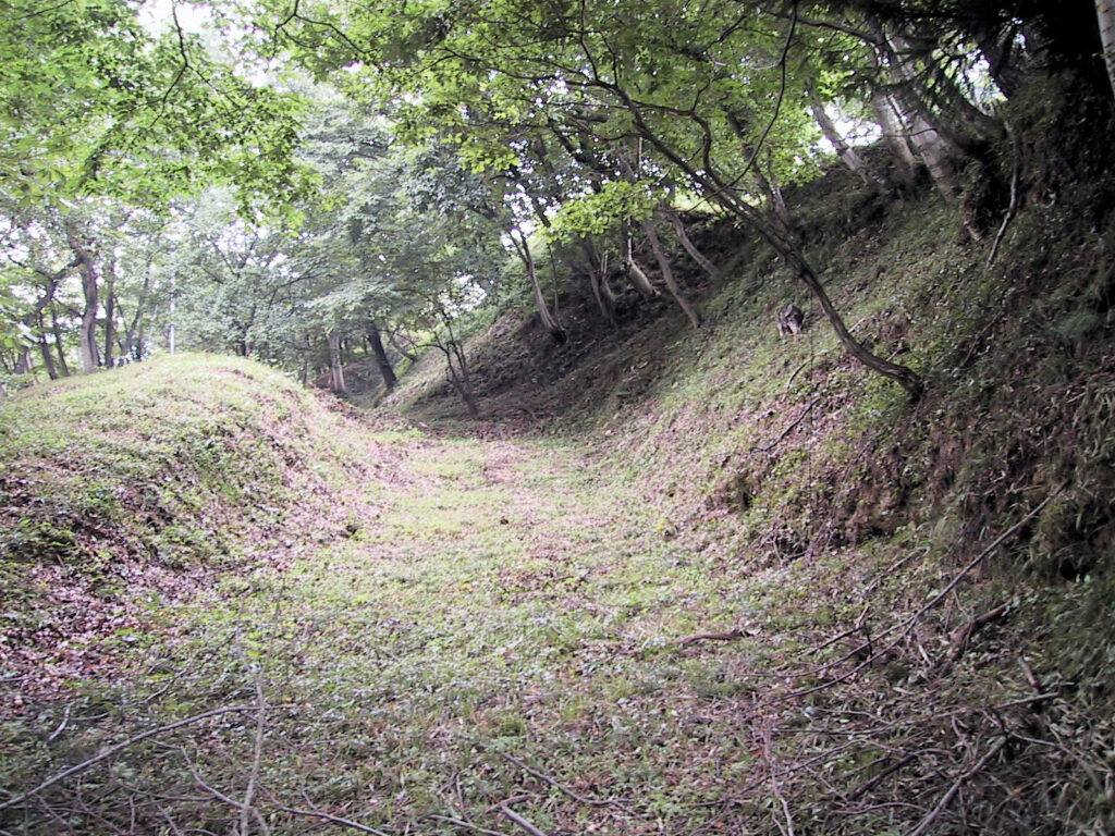 そこからは歩きましたが、すぐに広い平場があり、これが二の丸だったようです。しばらくするとかなり深くえぐられた空堀がありました。幅は10mほど、深さは5mくらいはありそうです。左端の方に狭く土橋状の通路があり、そこをわたると本丸です。