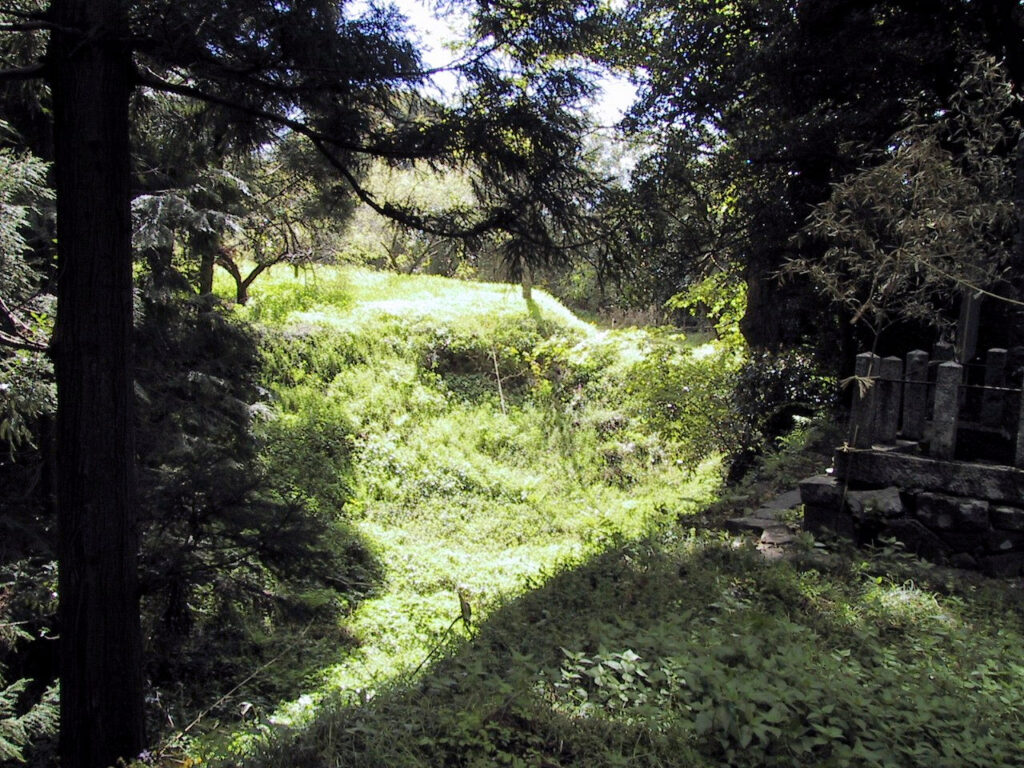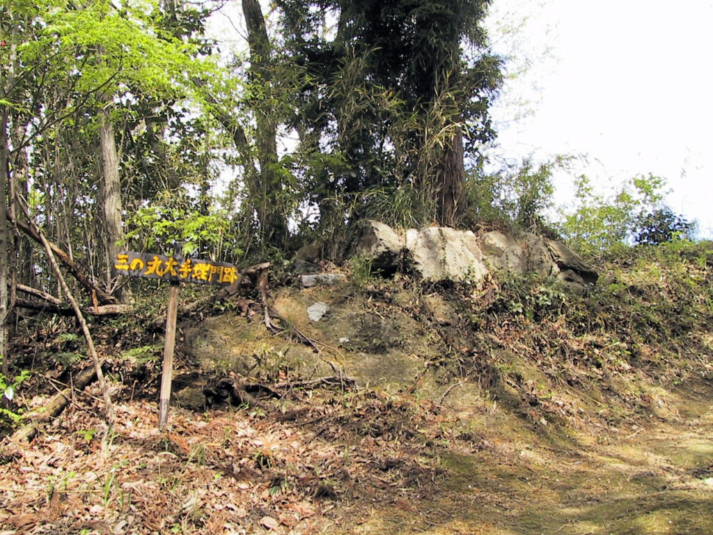 そこに車を置き坂道を上り始めました。まず見えるのは米蔵跡です。そこからさらに登ると三の丸大手埋門跡(石垣らしき物あり)、土塁跡、煙硝蔵跡があります。途中には不動堂もあります。本丸の近くには空堀もあり、幅は7~8mぐらいありそうです。