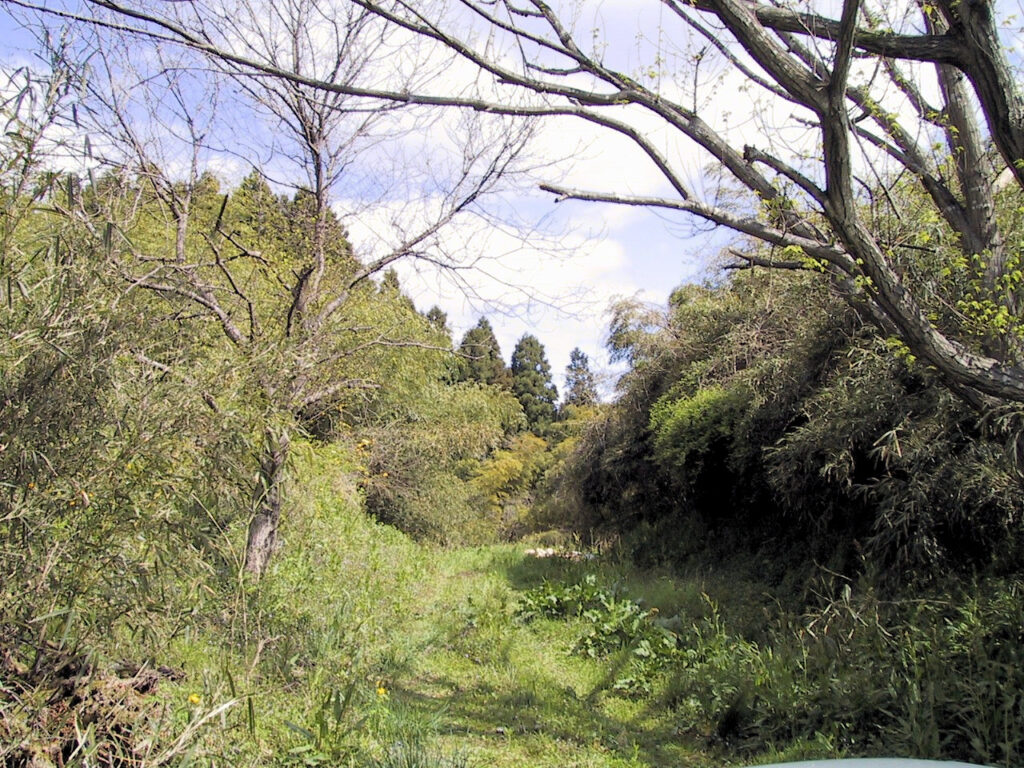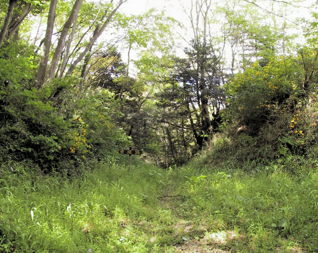 阿武隈川を渡り、丸森町市街地にはいると途中で左に相馬市へと抜ける道があります。そちらへ曲がりしばらくすると小さな川を渡る橋があり、わたると右に丸山城址という看板が見えたのでそこで右折し山の方へ登りました。途中で脇道のような所があったのでそこに車を停めました。丁度丘と丘の間に通路状のものが伸びているのですが、あとから確かめるとどうやらそこは二の丸と三の丸の間を区切る堀切だったようです。