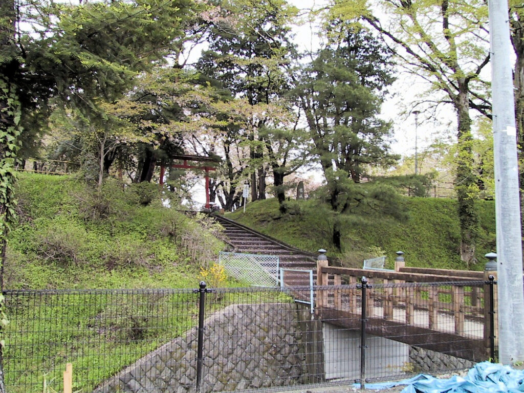 駐車場の端からぐるっと本丸跡を取り囲むように堀跡が残っていますが、現在はコンクリートで固められているのがとても残念です(^^;) また本丸跡の東側には迫川が流れ、自然の堀のようになっています。西側にある大手門跡の橋を渡って石段を登り、鳥居をくぐるとそこは本丸跡です。本丸跡には今は出雲神社・照日権現が建っていますが、社の近くには佐沼城の沿革を記した「佐沼城址碑」があります。また、本丸の端の方にはこんもりと若干盛り上がった土塁跡が認められ。かつての佐沼城の面影を残しているようです。