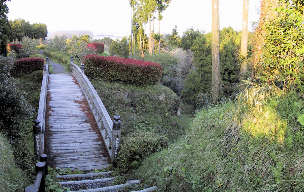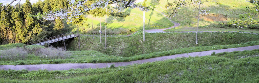 この頃にはだいぶん日も傾き、一日目の最後として松山町の千石城(松山城)を訪城しました。ここは現在、御本丸公園となっており、三の丸のすぐ下に駐車場があったので、そこに車を停めて歩いてみました。三の丸へ登る道を歩いていると、左側の下の方に堀切らしき物が見えました。さらに先に進み三の丸の左側の方に進むと、右側に三の丸と二の丸を仕切る堀切がありました。そこから二の丸に上がりさらに進むと、二の丸と本丸を仕切る堀切がまたあり、そこに架かっている橋を渡るといよいよ本丸です(といっても何もないんですけど(^^;))