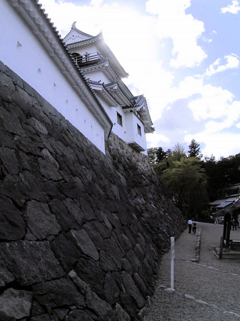Niftyのお仲間である福島の筈衛さんと天守下で待ち合わせをしていたのですが、私が到着して5分ほどで筈衛さんも到着しました。ネット上ではもう何年ものつきあいになるのに初めて会うというのは何とも変な感じですね(^^;) しばらくしゃべったあと、いよいよ大手門をくぐり天守へと向かいました。写真では見ていましたが、ホントきれいですね。石垣が妙に新しいなあと思ったら、積み直して再現したというのには驚きました。天守の中も復元ながら本物らしさが感じられる雰囲気がありました。