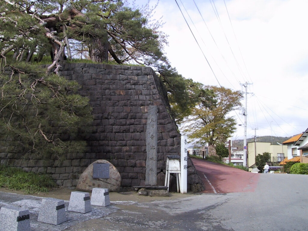 この寺池城は北上川西岸の丘陵の南端部にあります。本丸(居館)跡は現在裁判所となっているとのことだったので、まずは裁判所を探してみると、確かに裁判所がありました。ですが、とくに遺構や案内板などもなさそうでしたので、下に降りてみると「寺池城跡」の標柱を発見しました。この丘の西側の小学校の近くに駐車場がありましたので、そこに車を停め先ほどの標柱の所に所に戻ると、そこには明らかに後から作ったと思われる石垣と「史蹟寺池城址」の石碑がありました。そこから少し下った交差点付近は大手門跡らしく、「大手の柳」という木がありました。