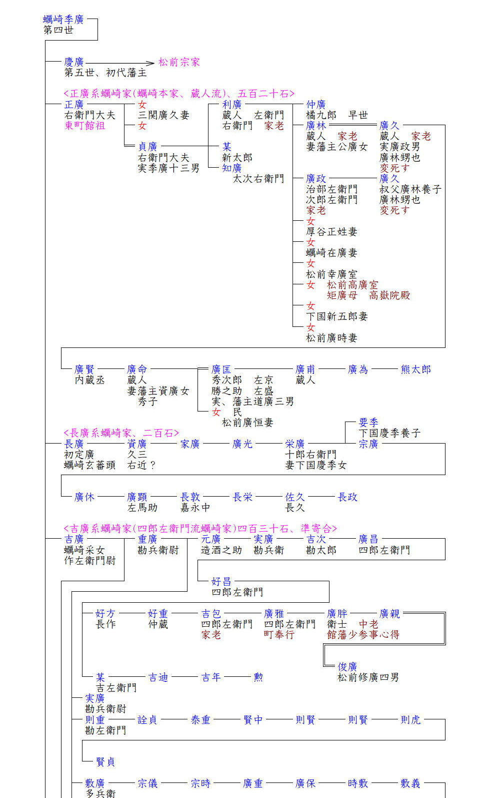 のちに季廣と河野氏女との子五世慶廣が六男景廣に河野家を継がせ、はじめ河野伊予と称しましたが、のちに松前姓を名乗り、景廣の系統は「河野系松前家」と呼ばれました。景廣は一族の系譜・歴史を書き連ねた『新羅之記録』を編纂したことでも知られています。