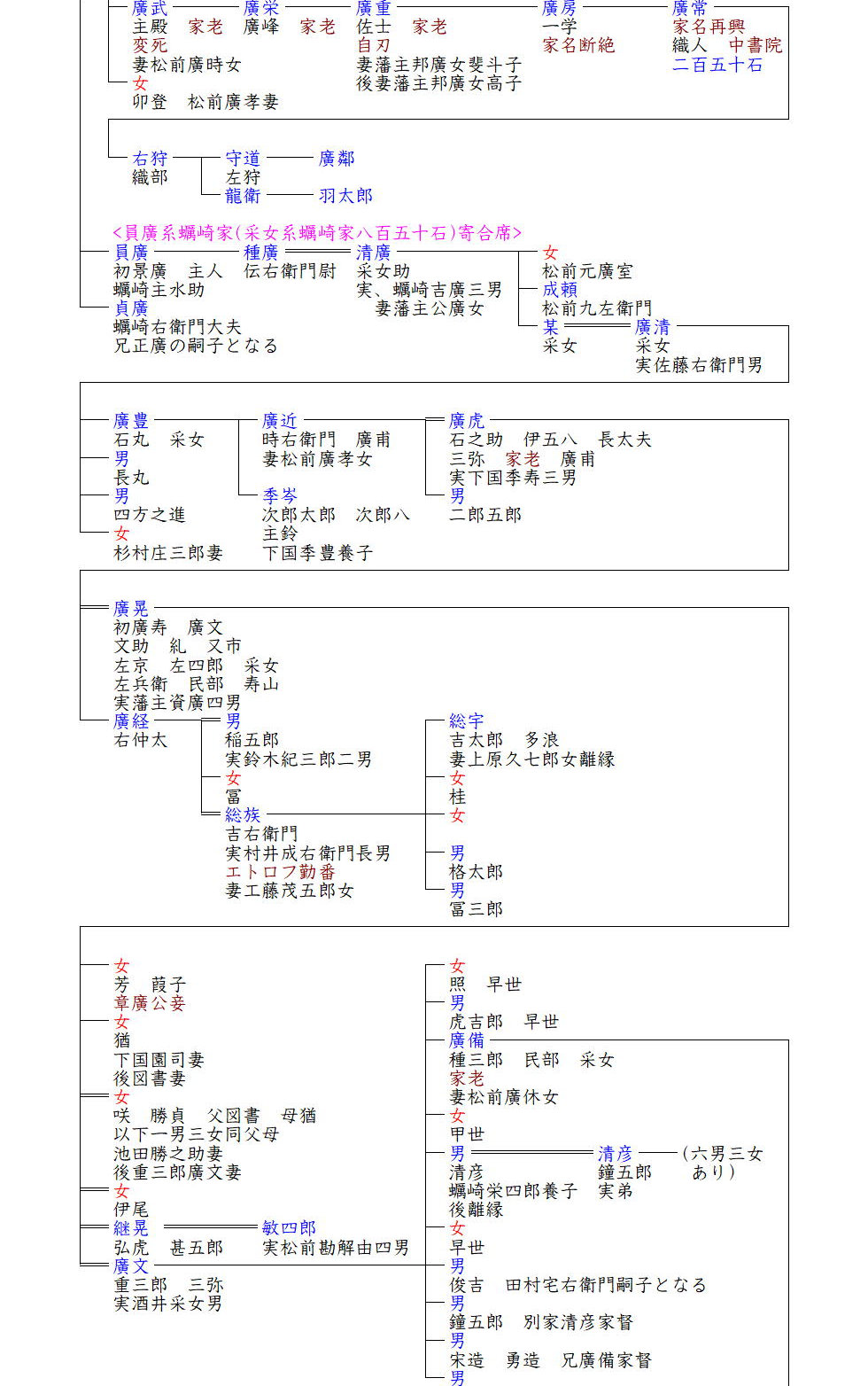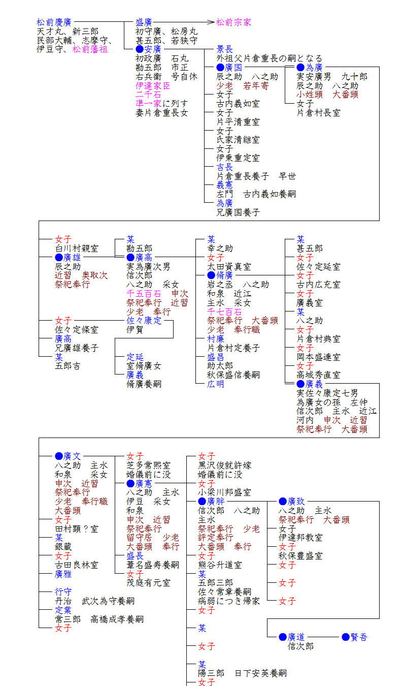 最後に成立したのが八世氏廣の弟幸廣を祖とする斎藤系松前家です。斎藤家の先祖実繁は出羽国由利郡の豪族でしたが、その娘が五世慶廣の継室となった縁で、実繁の子直政が寛永18年(1641)八世氏廣の家臣となりました。二代目はその子廣守が継ぎましたが、嗣子がなく、幸廣が廣守の姉を娶ってその名跡を継ぎ、のち松前姓を許されました。幸廣は兄廣[言甚]と争論のすえ兄を斬殺してしまいますが、自らも重傷を負い自刃して果てました。