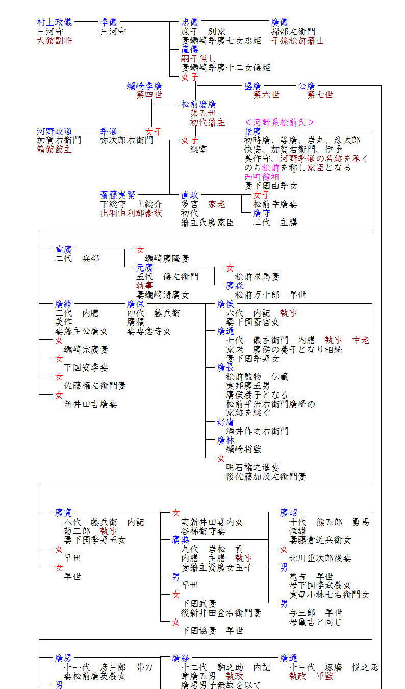 初代三河守政儀は松前大館の館主相原季胤の副将を務め、永正9年のアイヌの攻撃の際に自刃しています。その後は次第に蠣崎氏の家臣に組み込まれていき、政儀の子季儀を経て、季儀の長男忠儀は庶子のため別家して子孫は松前藩士となり、二男直儀が家督を継ぎますが、嗣子がなかったので五世慶廣と季儀の娘の間に生まれた六世盛廣の孫に当たる廣諶が村上家の名跡を継ぎ、松前姓を称して村上系松前家が成立しました。