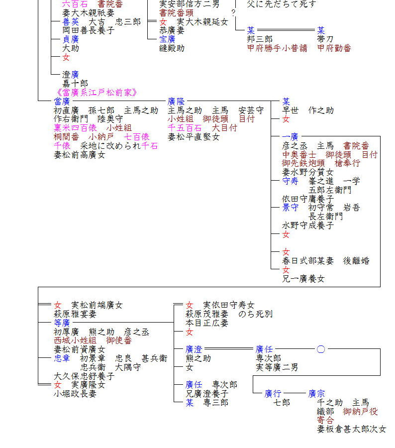 その後も松前宗家とのつながりは深く、矩廣の後継者問題でも泰廣の子嘉廣・當廣(もと直廣)らが矩廣の相談に乗っており當廣の嫡子廣隆・嘉廣の嫡孫端廣・嘉廣の猶子道廣の名前が後継候補として挙がっていました。この時は結局は忠廣系江戸松前家の邦廣が矩廣の嗣子となりましたが、その後も泰廣系の江戸松前家は松前宗家の相談役として、松前藩政および松前藩の対幕府対策に重要な役割を演じました。