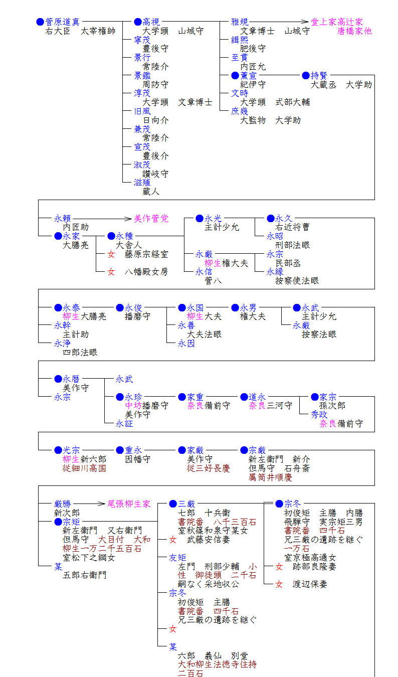 柳生家は菅原氏の末裔で、宇治関白藤原頼通が大和国四カ郷を春日社に寄進して神領とした際、四カ郷のうちの一つ小柳生の庄の奉行に任じられた大膳亮永家が柳生家の祖先になります。