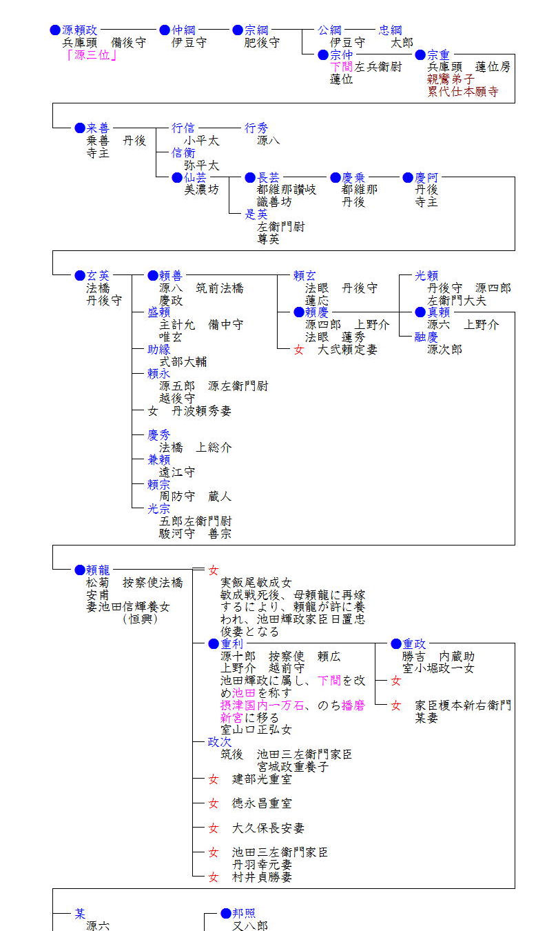 幕臣池田家は、清和源氏にその源を遡ります。「源三位」として知られる源頼政の曾孫宗仲は下間(しもづま)を称しますが、その子宗重は浄土真宗の開祖・親鸞聖人の弟子となり蓮位房を名乗り、以後下間家は親鸞の末裔である本願寺門主に仕え坊官を務めていました。