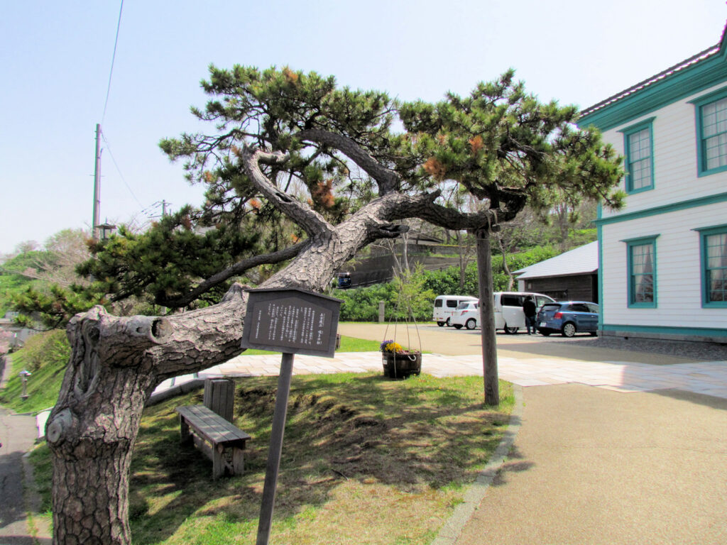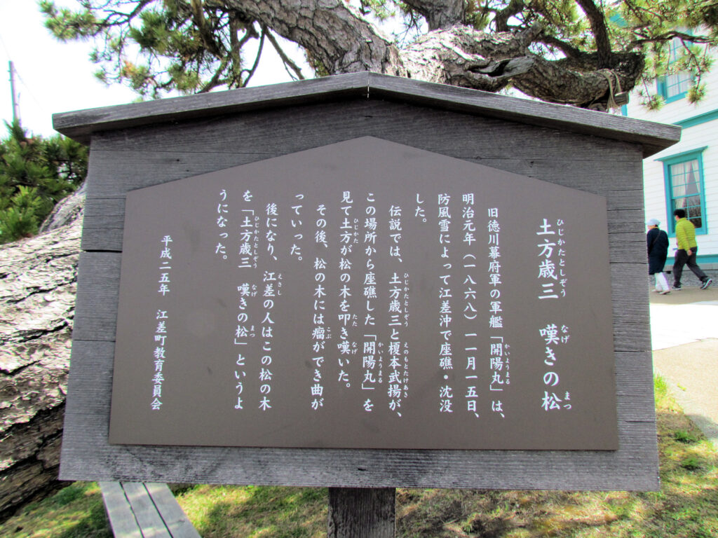 また前庭には、土方歳三と榎本武揚が江差沖で座礁した開陽丸を見ており、その際に土方が松の木を叩き嘆き、その後瘤が出来て曲がっていったという伝説が残る「土方歳三 嘆きの松」があります。また郡役所が出来る前、この場所には江差西在郷の行政経済を統括する藩府として檜山奉行所があったということでこの場所の前の坂を「奉行坂」と言ったそうです。その奉行坂の碑もすぐ前に立っています。